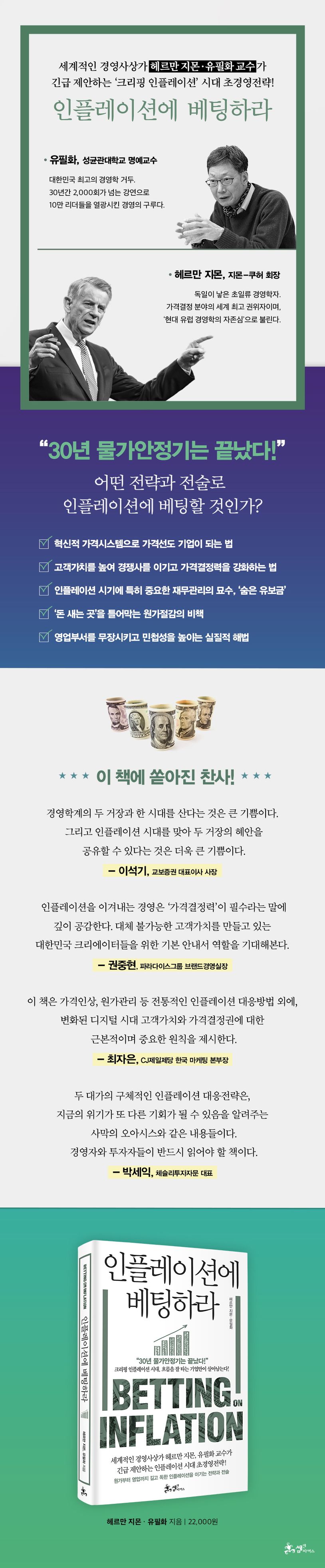 세계적인 경영사상가 헤르만 지몬 회장과 우리나라 최고의 경영학 거두 유필화 교수는 신간 《인플레이션에 베팅하라》에서 “지난 30년의 물가안정기는 끝났다.”고 선언하며, 이제 길고 독한 ‘크리핑 인플레이션’(꾸준하게 지속적으로 물가가 상승하는 인플레이션)을 맞설 때라고 경고했다. 물론 위험이 큰 만큼 기회도 많다. 현상을 제대로 분석해 흐름을 잘 탄다면 개인, 기업, 정부 등 모든 경제 주체에 기회가 될 수 있다. 이에 두 거장은 인플레이션에 어떻게 베팅(betting on inflation)하면 되는지, 그 전략과 전술, 해법을 제시했다.