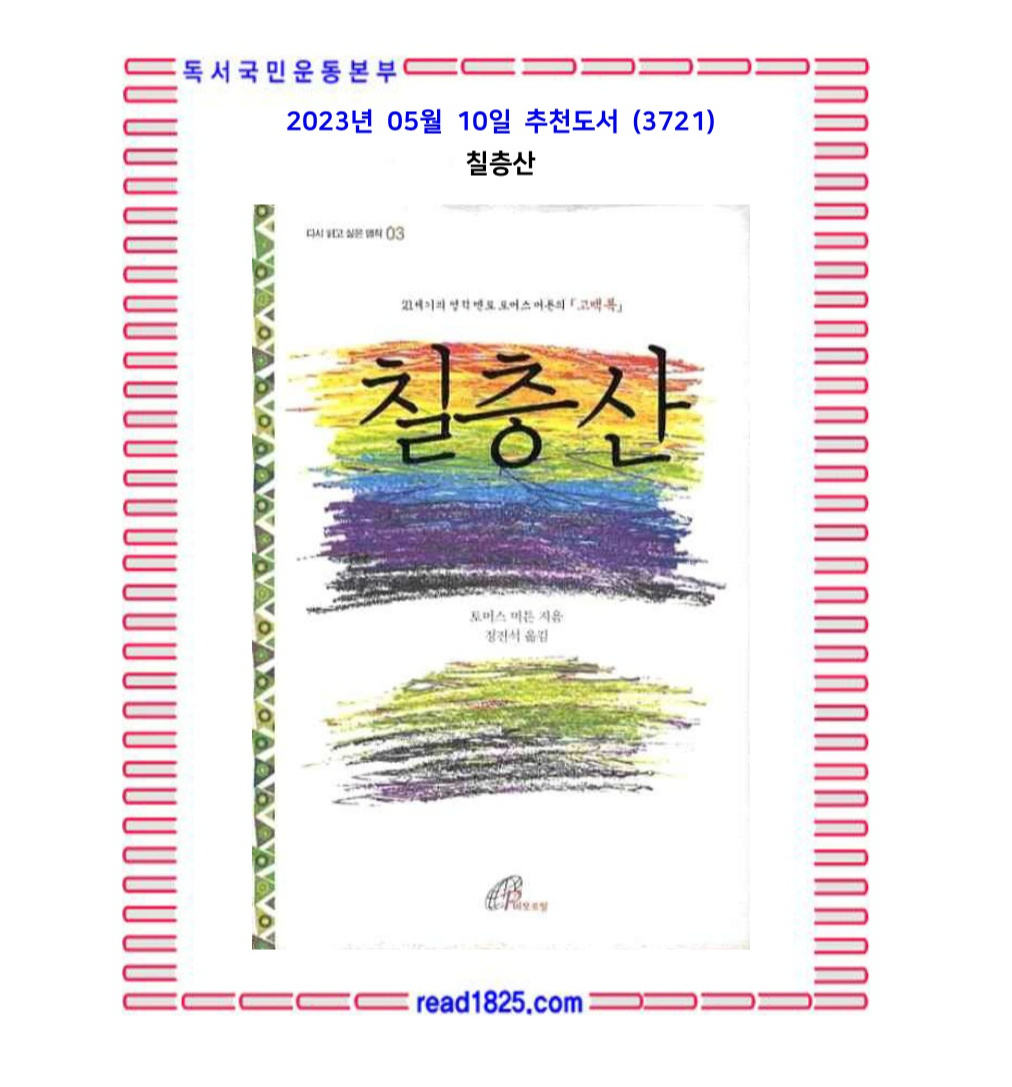 - 토머스 머튼의 「칠층산」을 읽다 보면 우리 삶을 섭리하시는 하느님을 만나게 됩니다. 내가 살아온 숱한 사연들이 나의 인생 이야기가 아니라 하느님의 이야기였음을 깨닫게 됩니다.