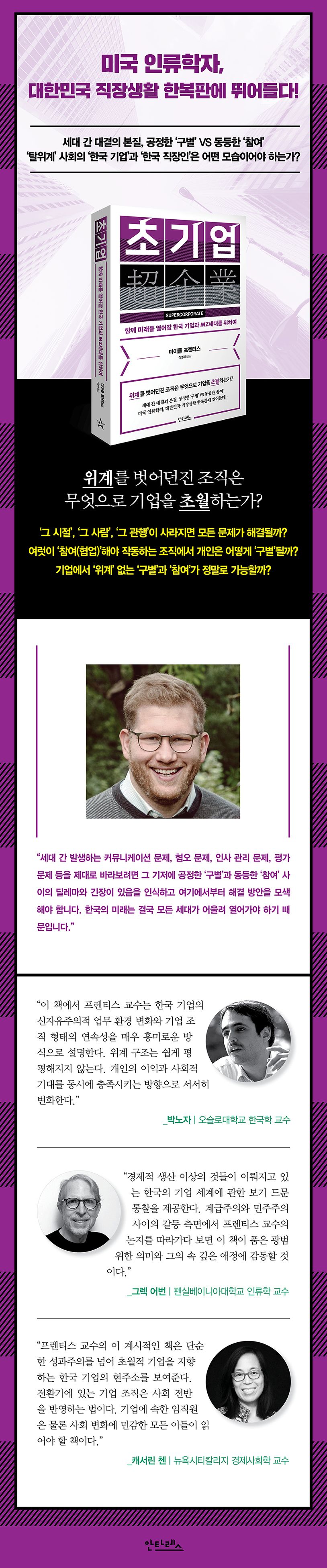 모든 사람은 늙고 언젠가 죽는다. 모든 세대는 뜨고 진다. 관습적인 위계질서는 끝났다. 미래를 준비해야 한다. 기성세대는 힘이 있을 때 기득권을 지키는 게 아닌 힘이 있을 때 이후 세대가 미래를 잘 이어나갈 수 있도록 지원해야 한다. 더욱이 ‘이윤 추구’라는 단 하나의 목적으로는 기업의 존재 근거를 찾을 수 없게 됐다. “조직의 이익이 나의 이익”이라는 기치 또한 주저앉은 지 오래다. 모든 주입 시도는 실패한다. 프렌티스 교수에 따르면 한국 기업들은 일찍부터 이 사실을 깨닫고 있었다. 그래서 단순한 위계질서만으로는 조직이 영속할 수 없기에, 끊임없이 혁신을 도모하고 구성원들의 욕구를 실현할 수 있는 기업, 즉 ‘초기업(supercorporate)’을 지향해왔다. ‘초기업’은 개인의 능력 구별과 동등한 참여 그리고 ‘탈위계’를 실현하려는 기업의 궁극적 이상향이다. 프렌티스 교수가 한국을 ‘초기업 사회’로 바라본 것은 기업 규모 말고도 기업이 사회에서 수행하는 역할, 특히 사람들의 정체성 형성에 미치는 영향까지 고려한 관점이다.
