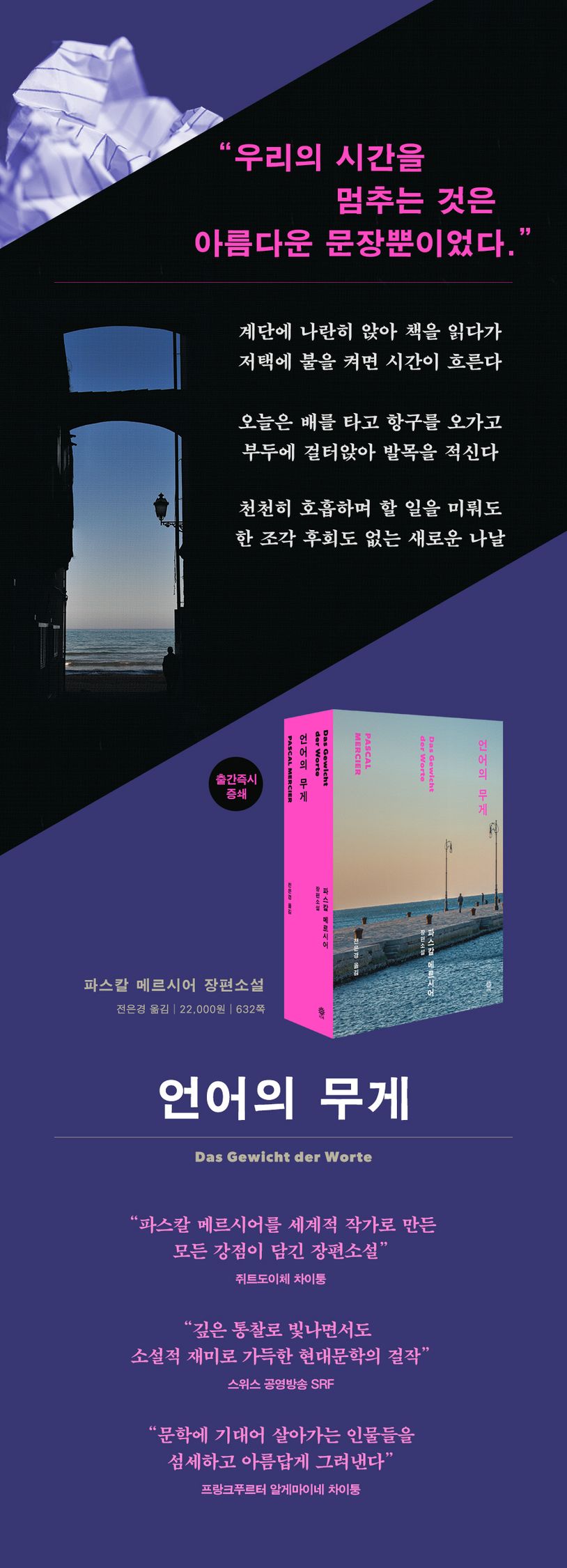 2020년 현지 출간한 《언어의 무게》는 13년 만에 선보인 장편소설로 유럽 문학계의 뜨거운 관심을 불러왔다. 주인공 사이먼 레이랜드는 시한부 진단을 받았다가 그것이 오진이었음을 알게 되고, 다시 열린 삶에서 그간의 인연을 돌아본다. 번역가를 꿈꾸게 한 삼촌과 출판사를 운영한 아내, 그곳에서 만난 수많은 작가와 번역가, 출판인…. 《언어의 무게》는 이들의 삶을 세밀한 필치로 그려내며 언어와 문학이 인간에게 어떤 의미까지 지닐 수 있는가를 통찰한다. 일반적 소설 형식을 뛰어넘는 깊은 사색, 문학에 기대 살아가는 인물들의 극적인 플롯과 유럽의 낭만적 풍경. 《언어의 무게》는 ‘파스칼 메르시어를 세계적 작가로 만든 모든 강점이 담겼다’는 평단의 극찬을 받고 〈슈피겔〉 연간 베스트셀러에 오르는 등, 급변하는 세상에서도 문학을 사랑하는 이들의 마음을 그러안는 장중한 서사로 문학의 건재함을 앞장서 증명하고 있다.