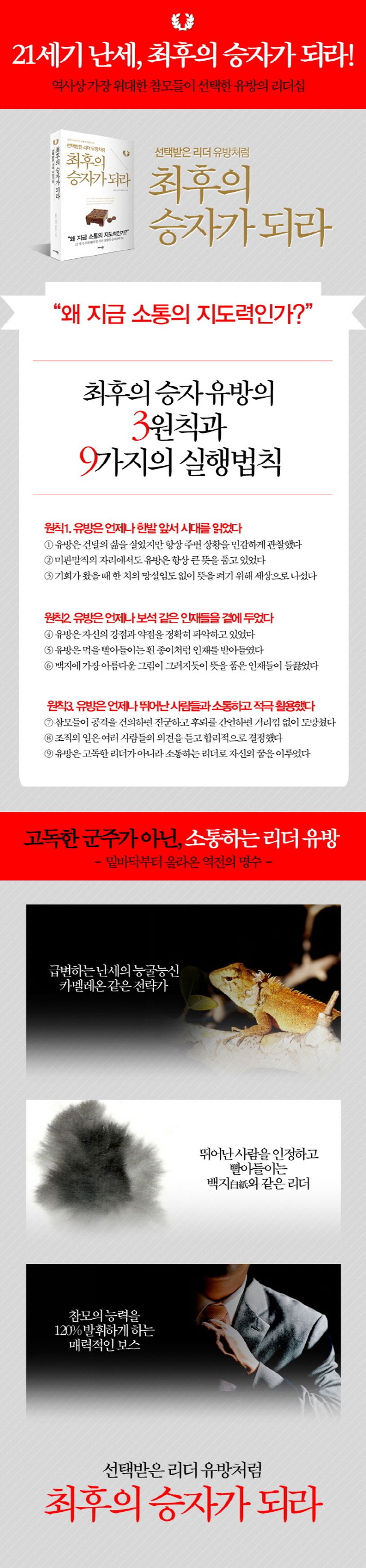 『최후에 승리하라-선택받은 리더 유방처럼』은 혼란의 시대, 수많은 결점과 열위에도 결국 최후의 승자가 된 유방을 주목한다. 중국 역사상 최초로 천하를 통일했던 진시황이 죽고, 천하의 주인이 사라지자 난세亂世가 도래했다. 이러한 혼란 속에서 중국 역사상 두 번째로 천하를 통일한 사람이 유방이었다. 비천한 가문, 미관말직에 무일푼, 학식도 부족했던 사나이는 무엇으로 천하의 주인이 되었는가?