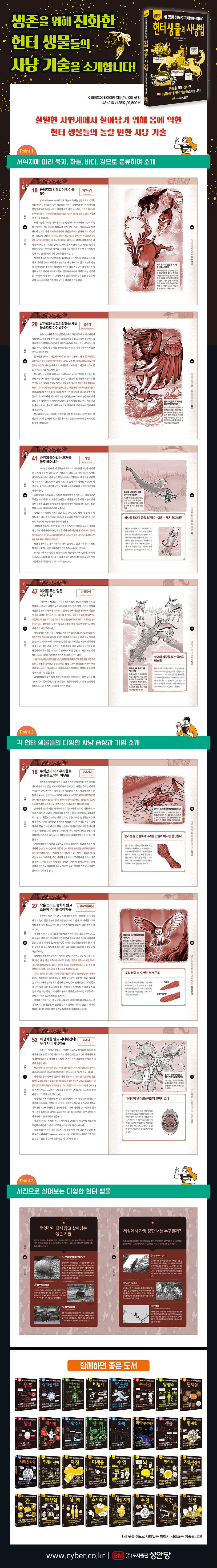 이 책에서는 동물들의 놀라운 사냥 기법을 그들의 서식지에 따라 육지, 하늘, 바다, 강으로 분류해서 소개하고 헌터 생물들이 먹이를 어떻게 포착하는지 그림과 함께 알기 쉽게 설명했다. 우리가 흔히 알고 있는 사자, 독수리, 상어는 물론, 잘 몰랐던 다양한 동물들의 생활방식과 사냥 기법까지 상세하게 다루어 흥미를 유발한다. 헌터 생물들의 영리하기도 하고 때로는 비겁하기도 한 독특하면서도 매력적인 세계를 만나 보자.