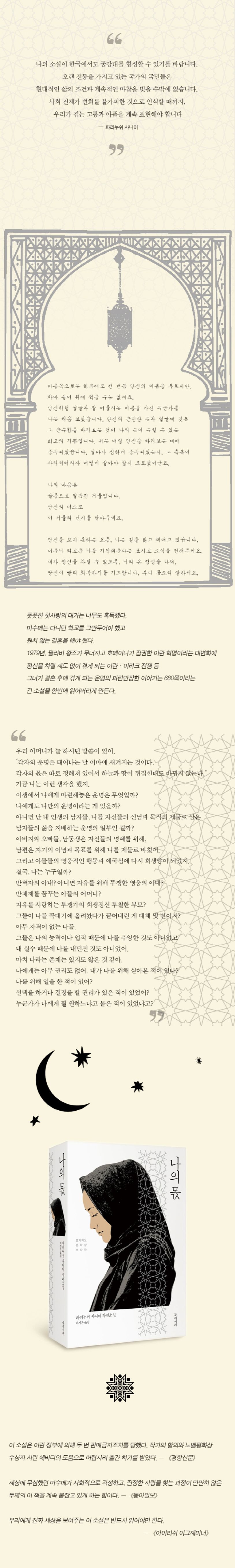 전통은 물론 소중합니다. 특히 이란 문명의 근간인 페르시아 문화는 섬세하고 아름답기가 이루 말할 수 없지요. 하지만 전통의 이름으로, 종교의 이름으로 여성들의 인권이 묵살되는 일은 더 이상 없었으면 좋겠습니다. 먼 나라라면 먼 나라의 상황일 수도 있으나, 마수메의 이야기가 이슬람에 대한 편견을 깨는 데에, 그리고 어떤 형태로든 부당한 처우를 받는 여성들에게 도움이 되기를 소망해봅니다. - 옮긴이의 말 중에서