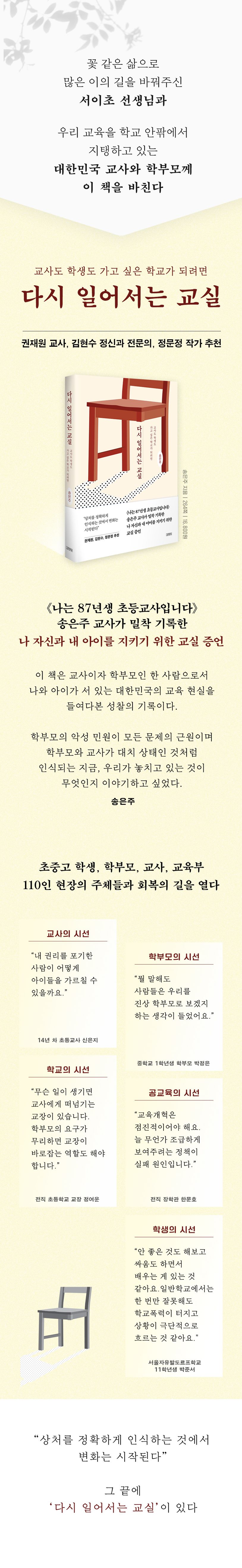 교사는 ‘잠재적 아동학대 범죄자’, 학부모는 ‘잠재적 괴물’처럼 여기며 갈등이 고조되는 현실에서 학교는 죽음으로 내몰리고 있다. 우리 아이들이 자라날 교실은 지금 어디로 향하고 있는가? 우리는 지금 어떤 것을 보지 못하고 무엇을 희생시키고 있는가? 더 늦기 전에 무엇을 살려야 하는가? 초중고 학생과 학부모, 교대생, 전현직 교사, 교장과 교감, 장학사, 교육부 관계자까지 교실과 관계된 모두의 상처와 희망을 담았다. 치열하게 말하고 각자의 상처를 이해할 때 서로를 살리는 길로 나아갈 수 있다. 그 끝에 ‘다시 일어서는 교실’이 있다.
