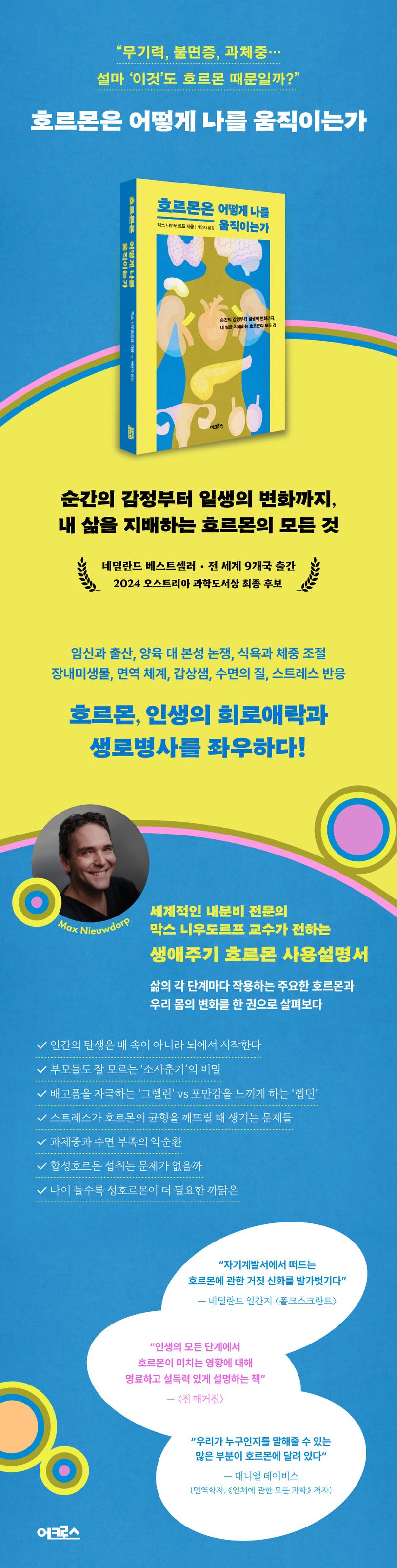 그간 호르몬에 관한 책들은 여성과 남성의 성적인 차이는 왜 나타나는지, 노화 방지를 위한 습관 개선 같이 특정 소재로 치우쳐 있는 경우가 많았다. 그렇기에 호르몬의 광범위하고 놀라운 영향력을 종합적으로 살펴보기에는 아쉬움이 컸다. 이 책은 호르몬을 중심으로 인간의 생애주기를 아우르는 동시에 양육 대 본성 논쟁, 식욕과 체중 조절, 장내미생물, 면역 체계, 수면의 질, 스트레스 반응 등 다양한 주제를 한 권에 담아냈다. 대표적인 호르몬 분비샘의 위치와 모양을 그림으로 보여주고, 미디어에서 자주 다루는 익숙한 호르몬의 숨겨진 역할과 배고픔 호르몬인 ‘그렐린’처럼 우리가 잘 몰랐지만 필수적인 호르몬이 순간의 선택과 감정뿐 아니라 일생의 변화를 주도하는 물질이라는 점을 독자들의 눈높이에 맞춰 매우 이해하기 쉬운 방식으로 설명한다.
