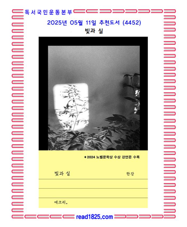 “역사적 트라우마를 정면으로 마주하고 인간 삶의 연약함을 드러내는 강렬하고 시적인 산문”이라는 선정 이유와 함께 2024년 노벨문학상을 수상한 작가 한강의 신작 『빛과 실』(2025)이 문학과지성사 산문 시리즈 〈문지 에크리〉의 아홉번째 책으로 출간되었다. 노벨문학상 수상 강연문 「빛과 실」(2024)을 포함해 미발표 시와 산문, 그리고 작가가 자신의 온전한 최초의 집으로 ‘북향 방’과 ‘정원’을 얻고서 써낸 일기까지 총 열두 꼭지의 글이, 역시 작가가 기록한 사진들과 함께 묶였다.