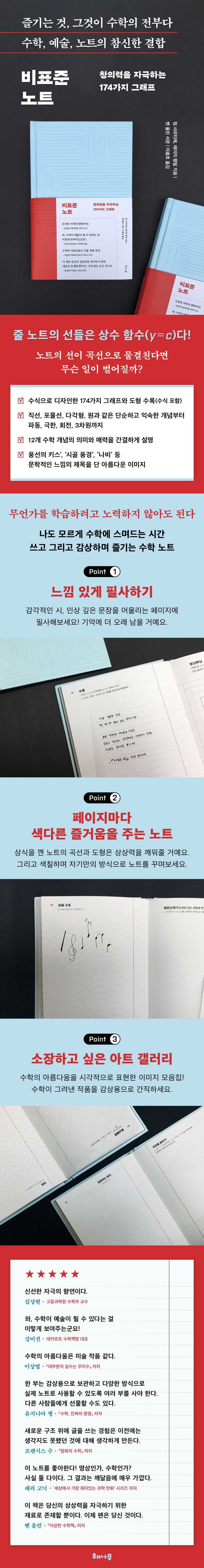 『비표준 노트』는 방향을 바꾼 직선, 포물선과 파동, 원의 겹침과 분할 등 다양한 수식이 그려낸 예술 작품 같은 그림을 담고 있다. 흔히 말하는 수학의 아름다움을 시각적으로 보여주는 동시에 노트라는 형식으로 누구나 부담 없이 수학을 접할 수 있도록 돕는다. 노트의 새로운 규칙은 생각의 흐름을 어떻게 바꿀까? 색다른 글쓰기와 그리기를 경험하며 가벼운 마음으로 수학을 즐겨보자.
