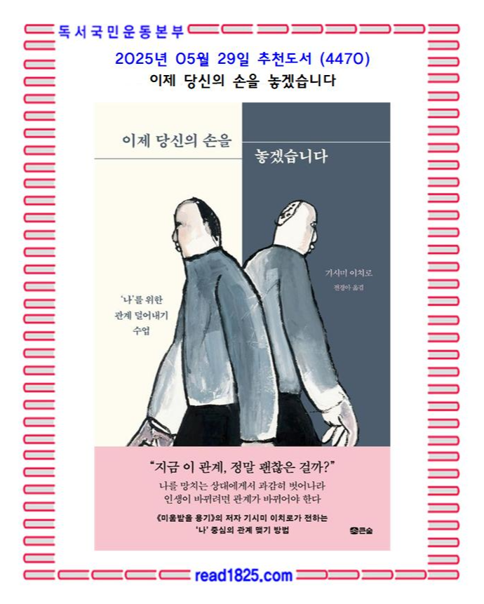 내 주변의 관계를 돌아보고 새로운 관계 맺기를 위한 첫걸음으로 삼기에 꼭 알맞은 관계 지침서 《이제 당신의 손을 놓겠습니다》가 큰숲에서 출간되었다. 빼곡히 얽힌 관계망 속에서 살아가는 현대인들은 그 관계 때문에 모순된 상황에 놓이기 마련이다. 풀리지 않는 관계로 고통 받기도 하고 자신과 잘 맞는 사람과 마음을 나누며 환희와 기쁨을 맛보기도 한다. 완전히 독립된 개인으로 살아가기를 원하면서도 누군가에게 기대고 의존하며 살고 싶어 하기도 한다. 우리는 혼자 있기를 원하는가, 아니면 누군가와 연결되기를 원하는가.