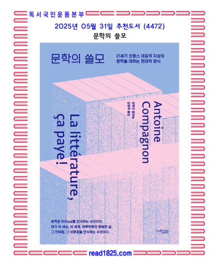 이 책에는 문학이 처한 현 상황에 대한 냉철한 관찰과 분석이 있고, 문학 교육의 올바른 방향에 대한 깊은 성찰이 있으며, 문학과 독서의 밝은 미래를 내다보는 낙관도 있다. 콩파뇽은 문학의 쓸모는 여전히 강력하니, 모든 사람의 삶과 교육에서 문학의 자리를 잘 유지하고 강화하는 것이 다른 무엇보다 시급하다고 역설한다. 문학과 독서, 둘의 응집체인 문학적 소양은 기다릴 줄 아는 사람들에게 늘 보상을 안겨주기에, “그것은 이득을 늦게 보는, 하지만 아주 큰 이득을 보게 해주는 투자다”라고 확신하기 때문이다. “문학은 돈이 된다!”라는 슬로건에 담긴 저자의 메시지는 단순한 상업적 성공이 아닌, 문학이 개인과 사회에 장기적으로 미치는 영향력을 강조하는 것일 테다.