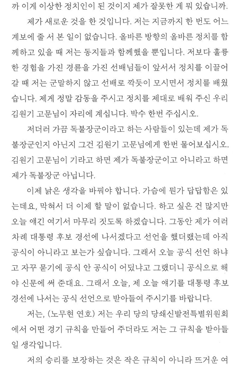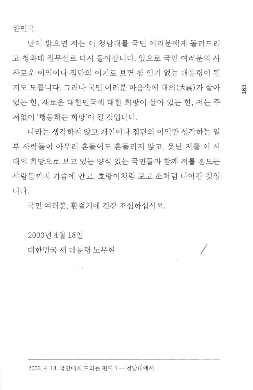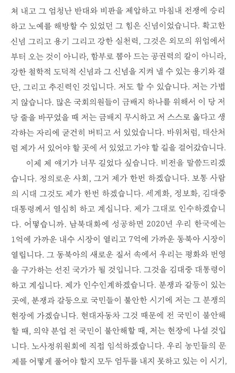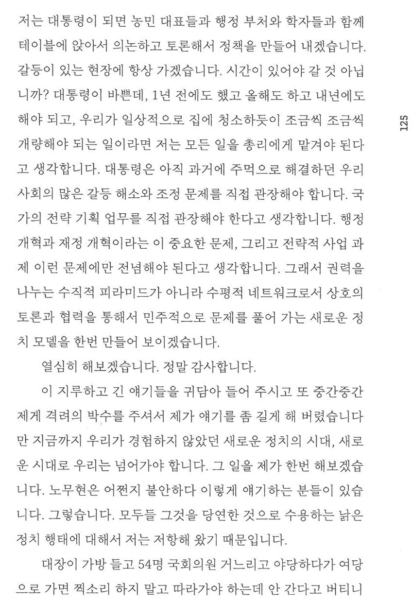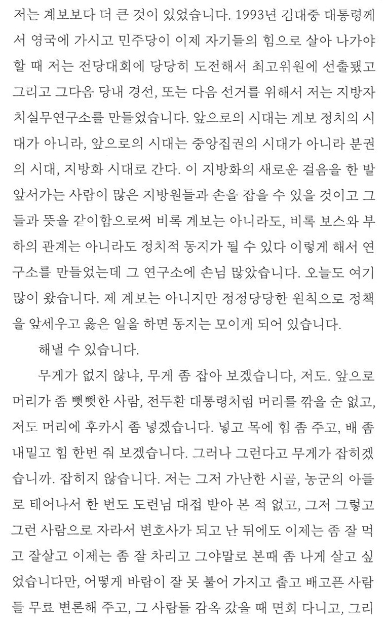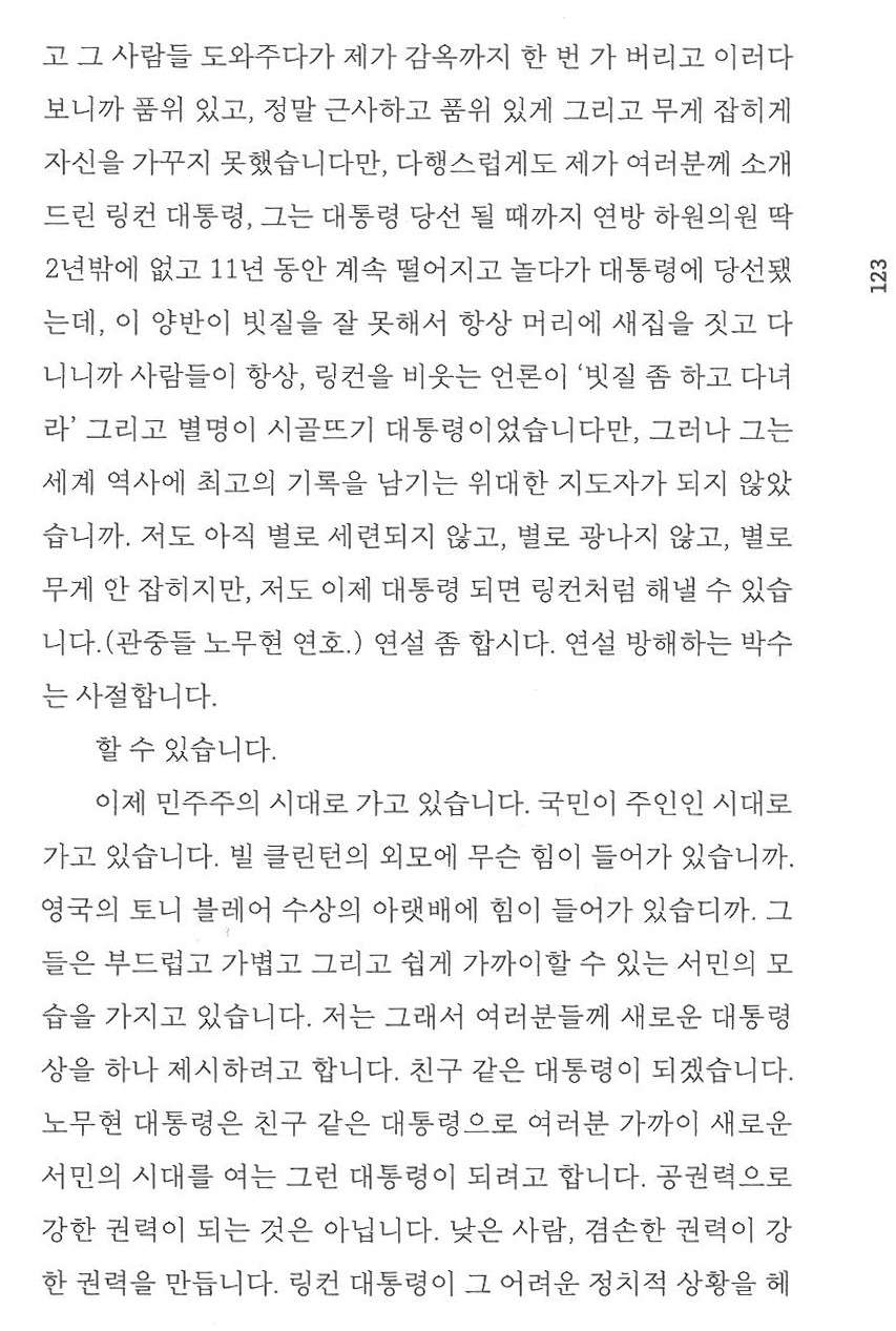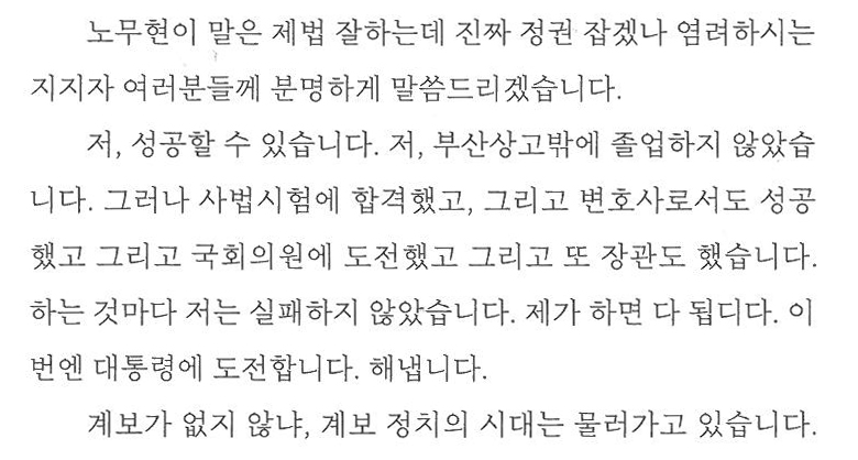 노무현 대통령은 특히 연설을 잘했다. 연단에 선 노 대통령의 모습은 투사였다. 정제되지 않았지만 귀에 쏙쏙 박히는, 국민들에게 쉽고 정확하게 모든 사안들을 설명했다. 한일관계 담화문 첫 문장이 “독도는 우리 땅입니다!”, 가슴 뛰게 하는 이 한마디가 그날 연설의 제일 첫줄이다.