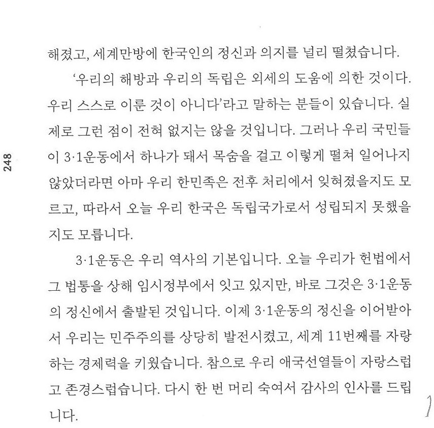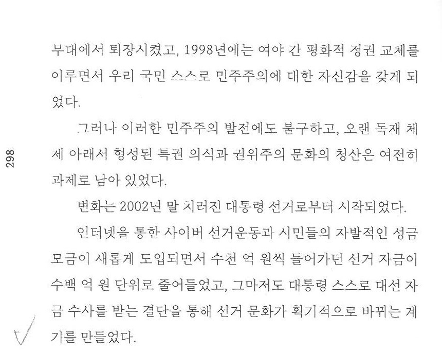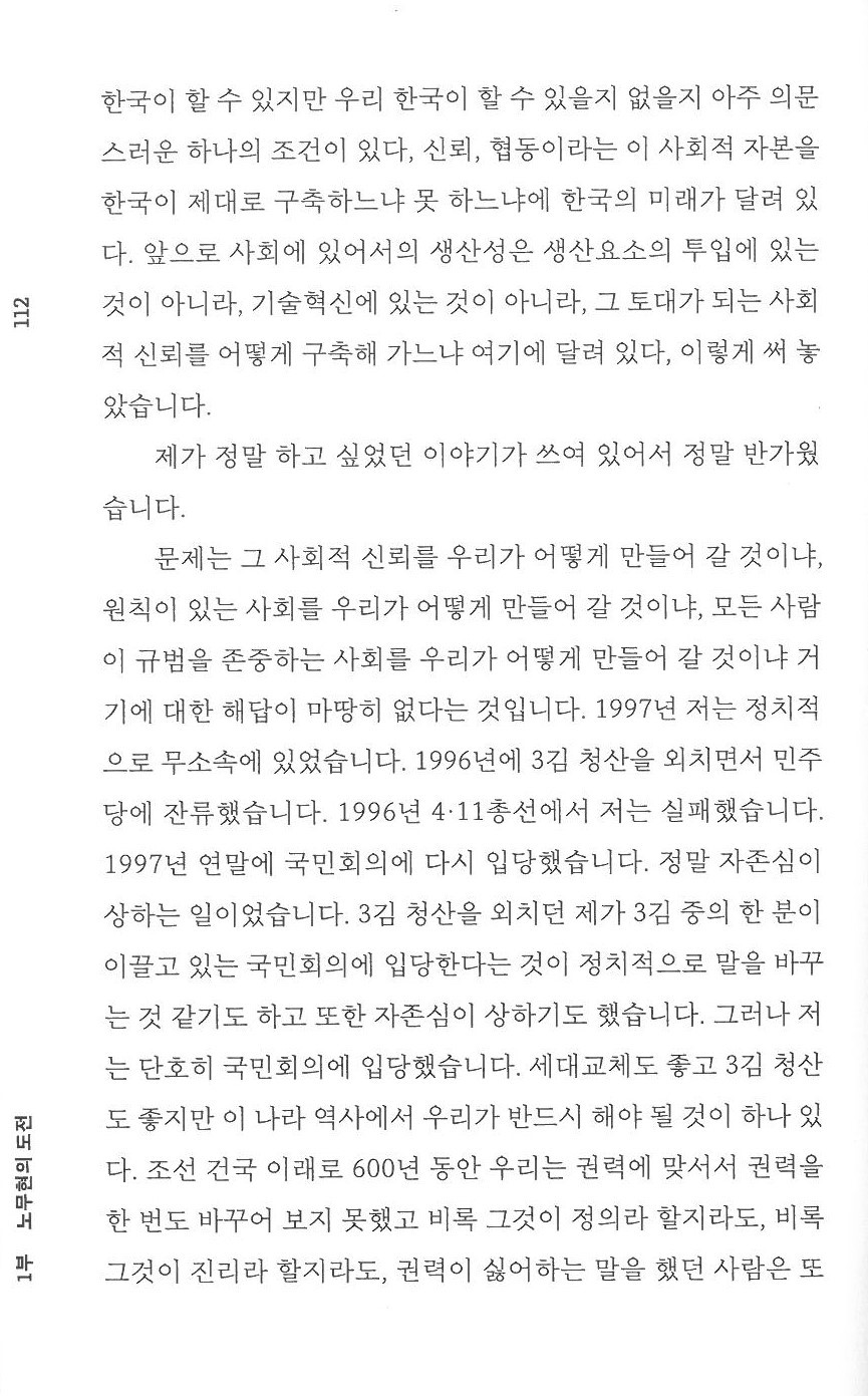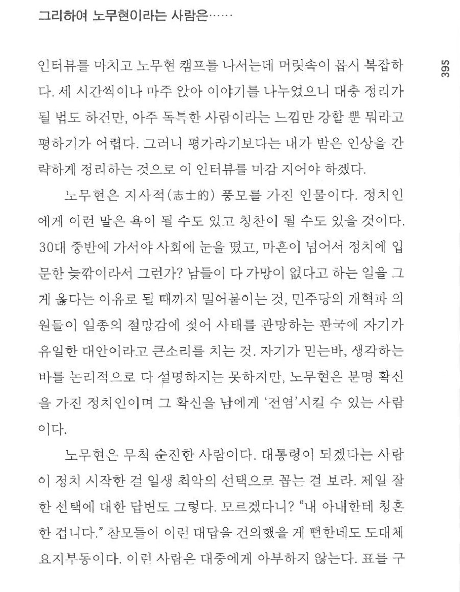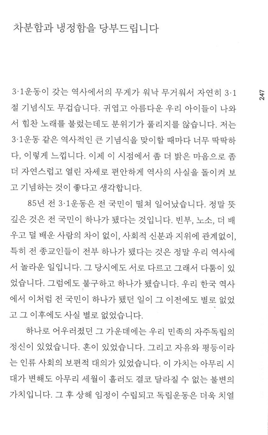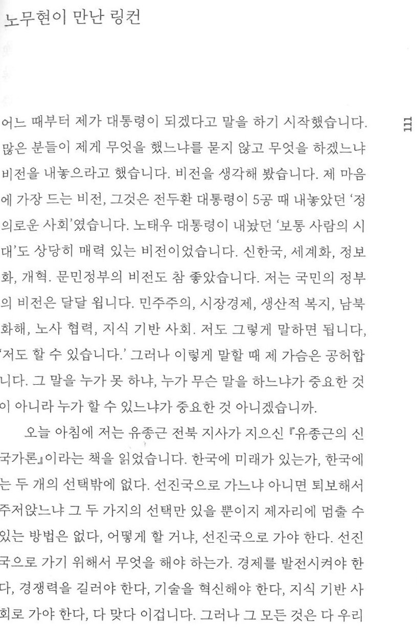 노무현 대통령은 특히 연설을 잘했다. 연단에 선 노 대통령의 모습은 투사였다. 정제되지 않았지만 귀에 쏙쏙 박히는, 국민들에게 쉽고 정확하게 모든 사안들을 설명했다. 한일관계 담화문 첫 문장이 “독도는 우리 땅입니다!”, 가슴 뛰게 하는 이 한마디가 그날 연설의 제일 첫줄이다.