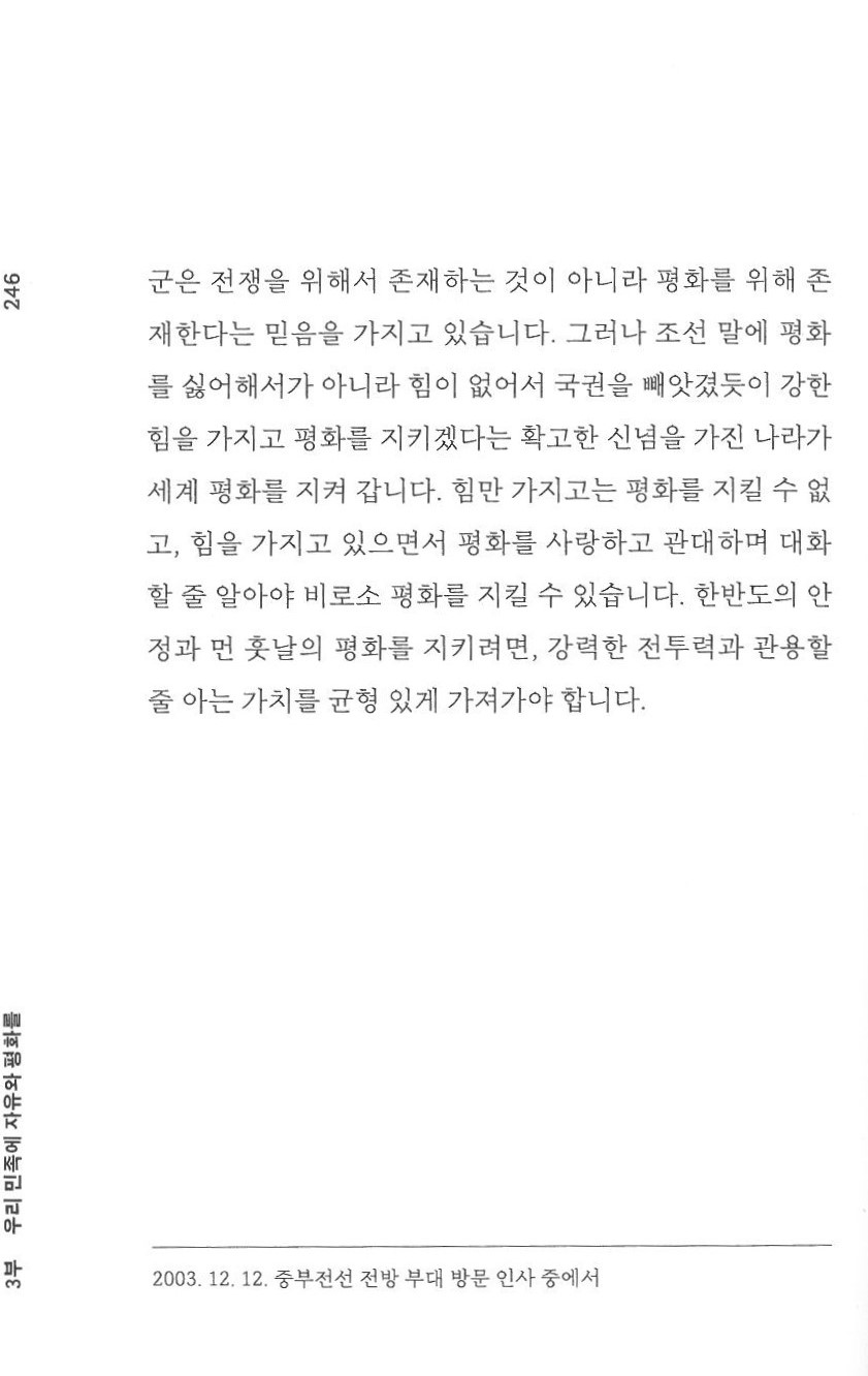 3부 ‘우리 민족에게 자유와 평화를’은 민족의 평화와 통일을 염원한 노무현 대통령의 바람을 적었다. 통일과 경제발전 등 모든 가치에 우선하는 것은 민족의 자유와 평화다. 평화를 향한 그의 의지와 노력을 엿볼 수 있다.
