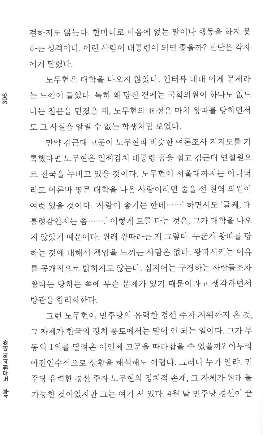 4부 ‘노무현과의 대화’는 유시민 작가와 노무현 대통령의 대담을 한 편 실었다. 이 대화가 이루어진 시기는 2002년 2월 15일. 당시 노무현 대통령은 민주당 상임고문이었고, 유시민 작가는 시사평론가로 활동하던 시기다. 당시 노무현 대통령은 대선 출마를 선언한 뒤였으며, 따라서 이 대담은 대선 후보 사전 인터뷰의 성격이 강하다.