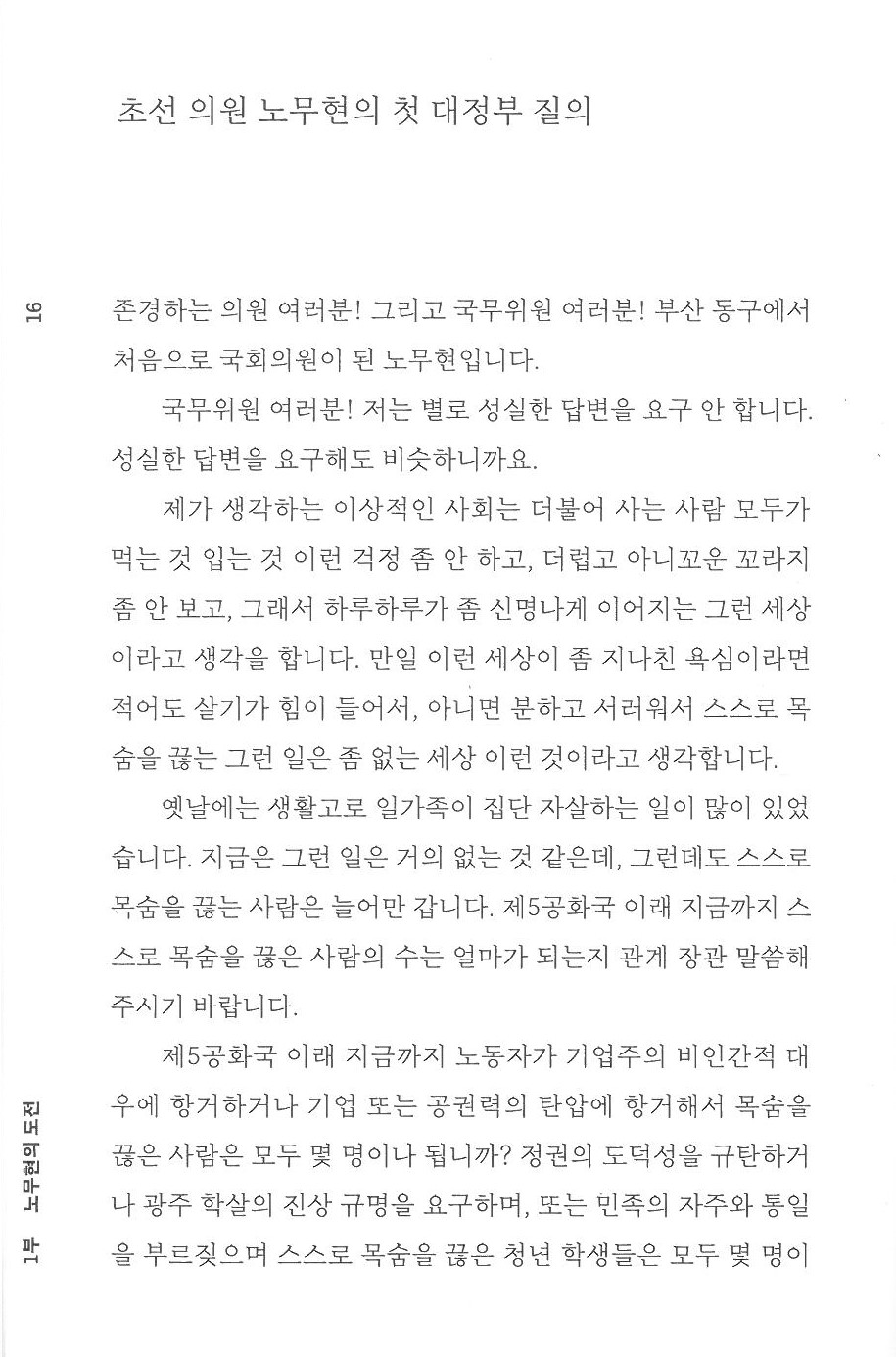 노무현 대통령의 초선 국회의원 시절 대정부 질의는 그야말로 노무현이라는 인간의 진면목을 보여준다. 대정부 질의문 중 두 부분을 소개한다.