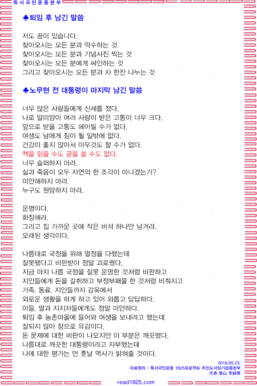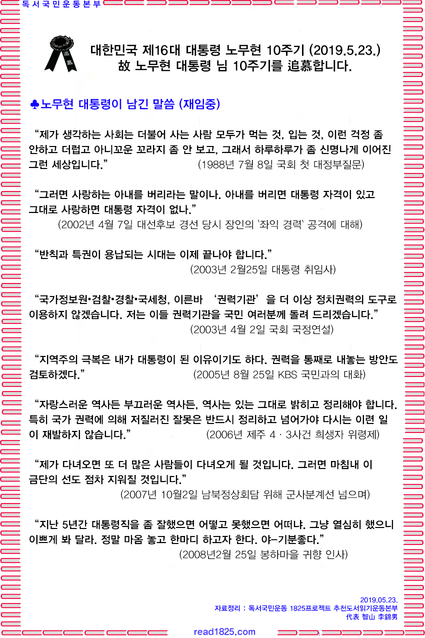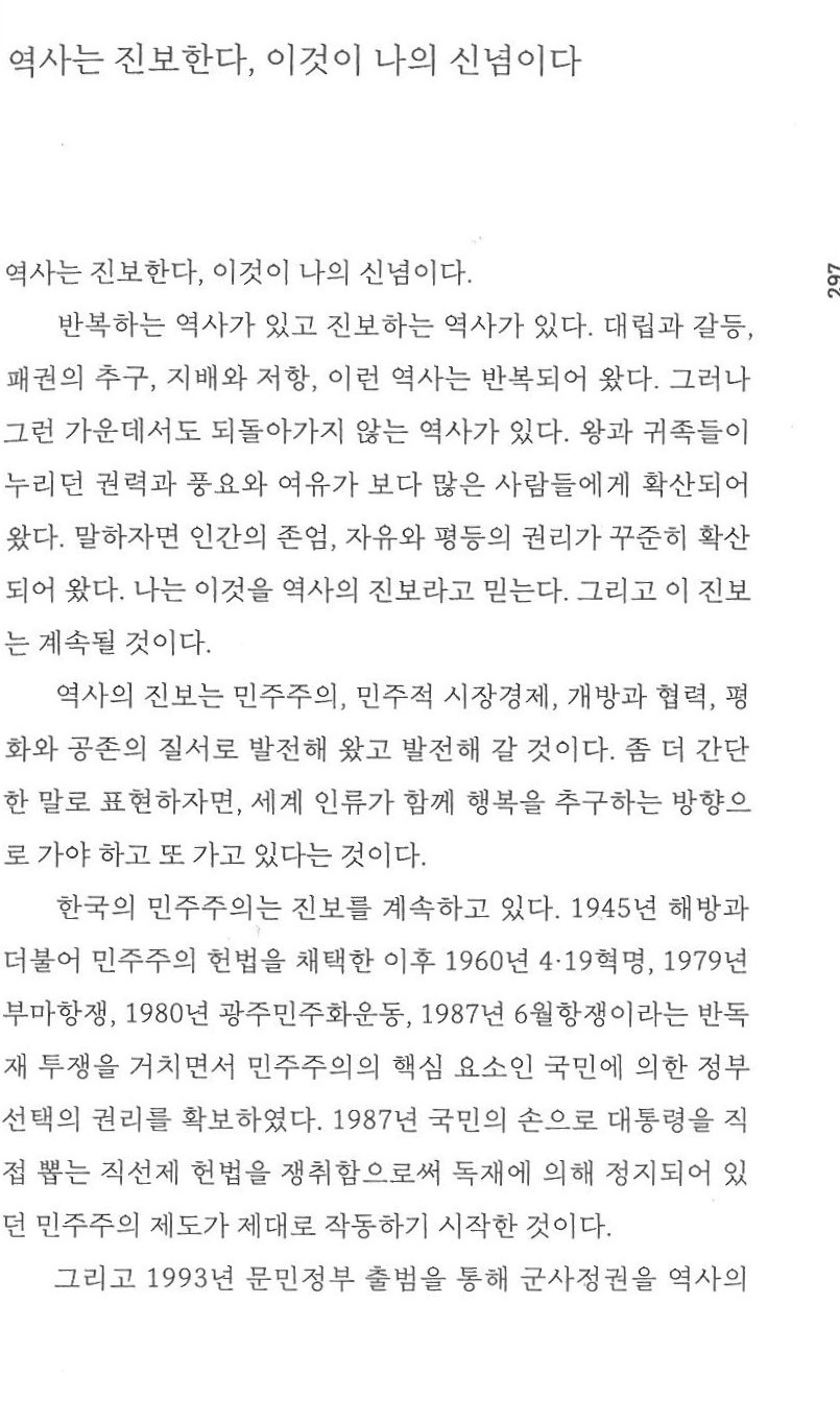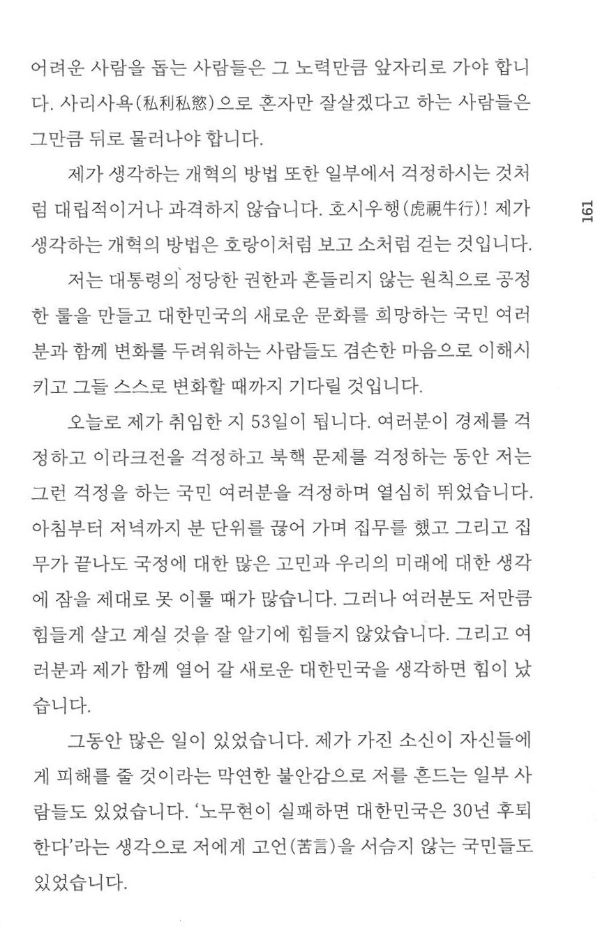 방송 뉴스를 봤더니 대통령이 말이 많다고 합니다. 저더러 말을 줄이라고 합니다. 독재자는 힘으로 통치하고 민주주의 지도자는 말로써 정치를 합니다. 제왕은 말이 필요 없고, 권력과 위엄이 필요합니다. 그러나 민주주의 사회에서는 말 못하는 지도자는 절대로 지도자가 될 수 없습니다. 전 세계 민주국가의 지도자 가운데 말하지 않는 지도자가 어디 있습니까. 클린턴 전 대통령도 엄청나게 말을 많이 했고, 토니 블레어 영국 총리도 국회의사당에 나와 야당 지도자와 토론하고 치고받고 반박하고 비꼬는 말을 했습니다. 제가 (2002년 대통령) 선거 때 말 못하게 했으면 어떻게 대통령이 되었겠습니까. 대통령에 당선된 날 입을 딱 다물어 버리라는 것입니까. 말이 안 되는 얘기입니다. 대통령이 가진 (통치) 수단 가운데 중요한 것은 인사권과 말입니다. _『노무현 1946~2009』 2006. 12. 28. 중에서