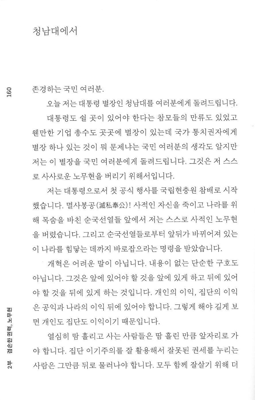 2부 ‘겸손한 권력, 노무현’은 대통령 재임 시절의 글들을 모았다. 비교적 1부의 글에 비해 정제되어 있는데, 이는 청와대 비서관실에서 어느 정도 연설문을 매만졌기 때문이라 생각되지만, 그럼에도 불구하고 노무현의 정신은 생생히 살아 숨 쉰다.