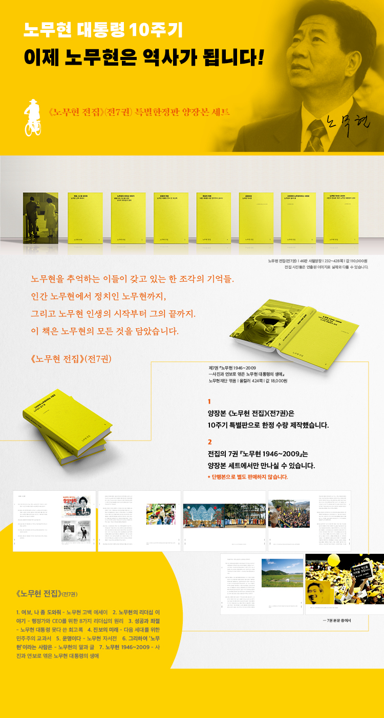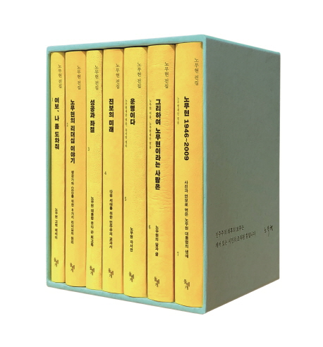 있는 것을 가려 모아 말글집을 만들었습니다. 1권 『여보, 나 좀 도와줘』와 2권 『노무현의 리더십 이야기』, 3권 『성공과 좌절』, 4권 『진보의 미래』, 5권 『운명이다』는 이미 나와 있던 책이지만, 노무현 대통령의 말과 글을 모은 6권은 새로 편찬한 것입니다. 전집 세트를 통해서만 만나실 수 있는 7권은 사진과 함께 보는 노무현 대통령의 연보입니다. 앞의 책들 곁에 함께 두고 보시면 노무현 대통령의 삶이 더 풍부하고 입체적으로 다가올 겁니다.
