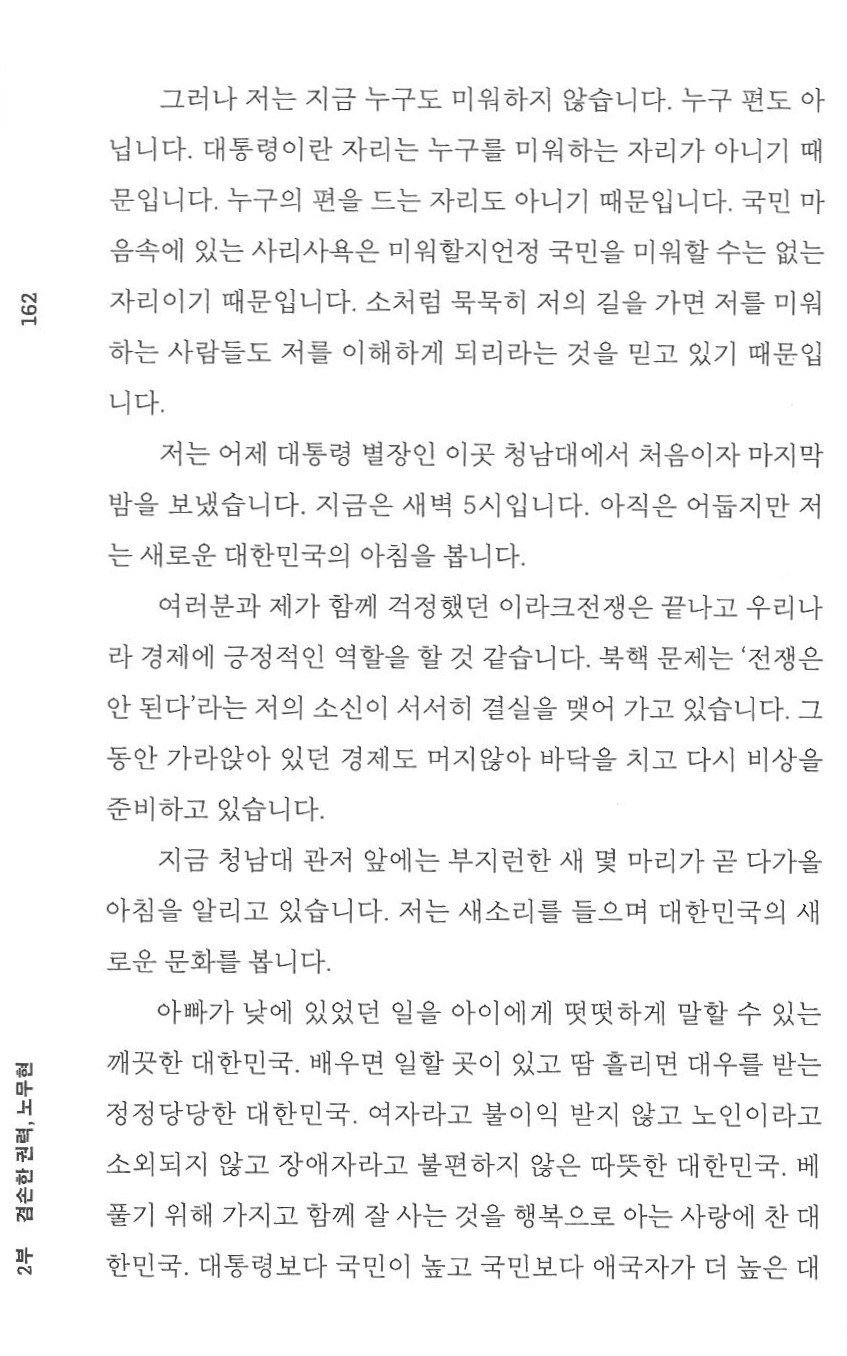 2부 ‘겸손한 권력, 노무현’은 대통령 재임 시절의 글들을 모았다. 비교적 1부의 글에 비해 정제되어 있는데, 이는 청와대 비서관실에서 어느 정도 연설문을 매만졌기 때문이라 생각되지만, 그럼에도 불구하고 노무현의 정신은 생생히 살아 숨 쉰다.