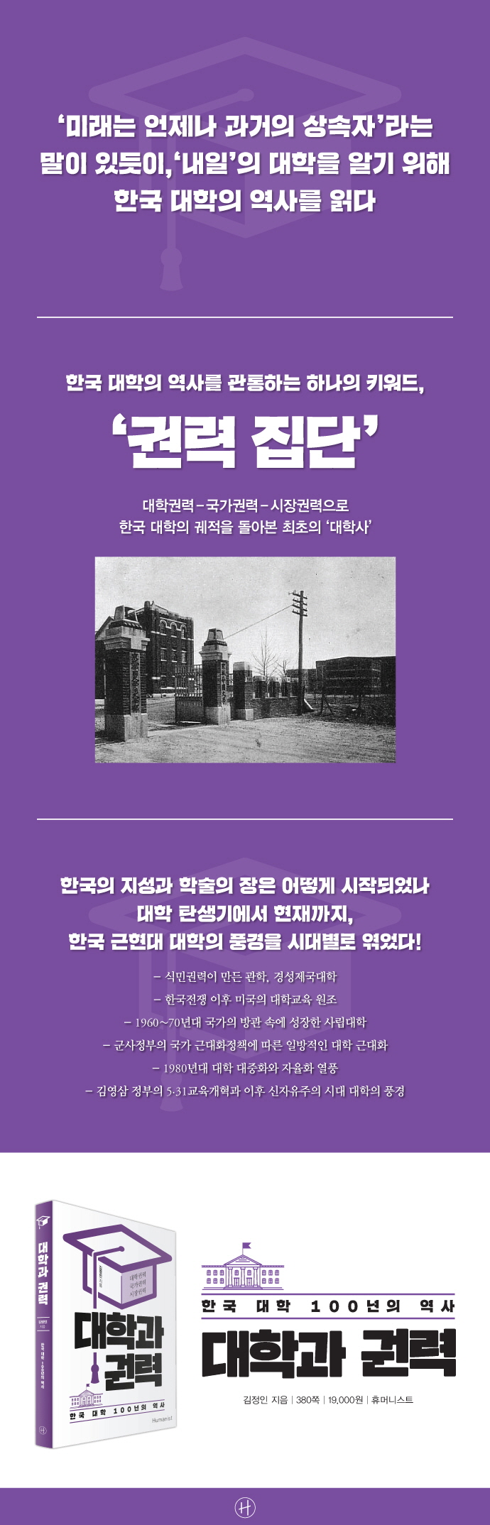 이 책은 오늘날 대학 문제의 뿌리를 찾기 위해 한국 대학 100년의 궤적을 돌아본 최초의 ‘대학사’이다. 현대사 가운데 대학사라는 분명한 주제의식을 염두에 두고 연구한 성과00물이자, 앞으로 한국 대학이 나아가야 할 미래를 담고 있다. 저자에게 대학이란, 스무 살 대학 신입생 시절부터 대학 교수로 강단에 서 있는 지금까지 단 한 번도 벗어난 적 없는 삶의 현장이자 학문의 터전이었다. 그 한가운데 서 있던 저자는 끊임없이 대학 문제에 관해 고민하다 대학의 역사를 통해 대학이 나아가야 할 미래를 바라보고자 이 책을 썼다. 지금까지 한국 대학의 시작부터 현재까지 대학사를 정리한 역사서는 없었다. 이 책에서 저자는 한국 대학의 역사를 관통하는 하나의 키워드로 ‘권력집단의 힘’을 꼽았다. 이를 포착하기 위해 대학권력-국가권력-시장권력이라는 권력의 3주체를 중심으로 한국 대학의 역사를 톺아본다. 한 사회의 구성원을 이해하려면 사회가 이룩한 교육체제나 그 안의 구성원들이 어떻게 양성되는지 교육방식이 매우 중요하다. 대학사를 분석한다는 것은 그 사회의 단면을 드러내는 작업과도 같다. 각 장에는 역사적 사실과 함께 저자가 연구하며 직접 작성하거나 참고한 통계들을 표로 작성하여 근거로 제시했다.