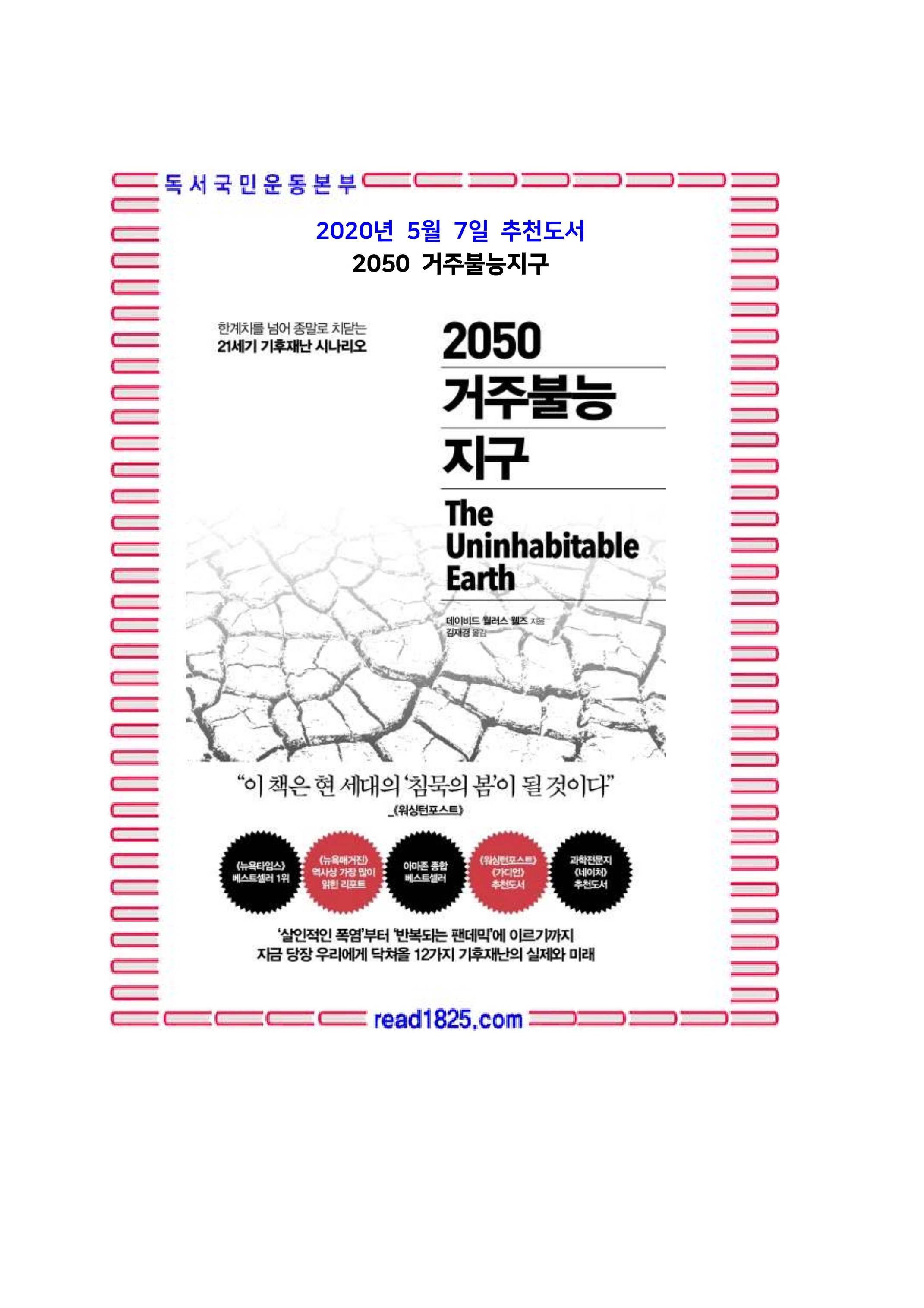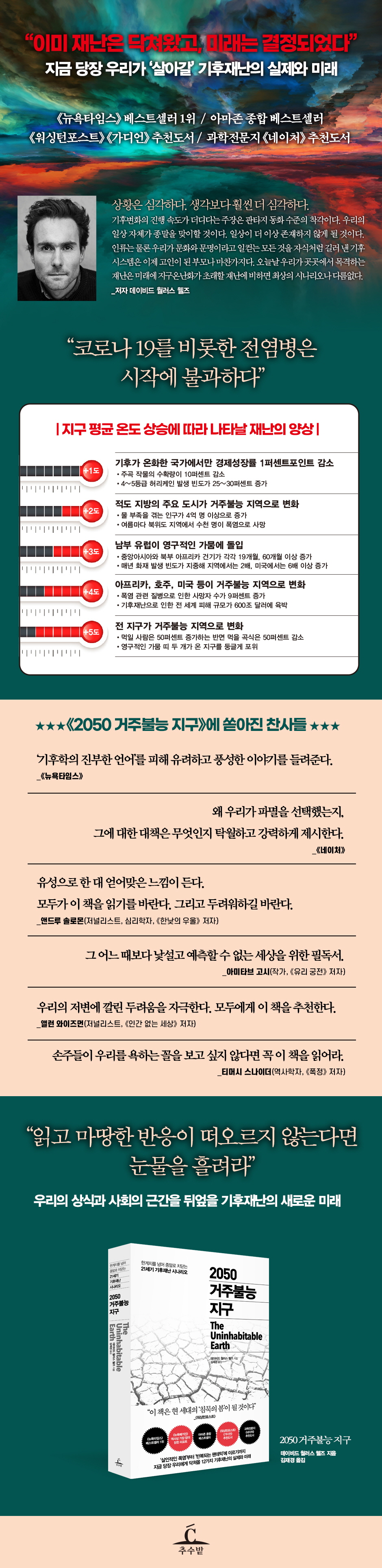 기후변화는 단순히 자연이 인간에게 가하는 ‘복수’도 아니고, 인간이 손쓸 도리가 없는 자연의 ‘처벌’도 아니다. 기후변화를 부정하는 것만큼이나 나쁜 태도는 이미 찾아온 재난 앞에서 인간은 어찌할 수 없다는 ‘절망’과 ‘체념’이다. 《2050 거주불능 지구》는 이와 같은 섣부른 종말론이나 허무주의를 경계하며 정치, 경제, 사회, 문화는 물론 우리 자신의 삶과 태도마저 송두리째 바꿀 기후변화의 새로운 미래를 제시한다.