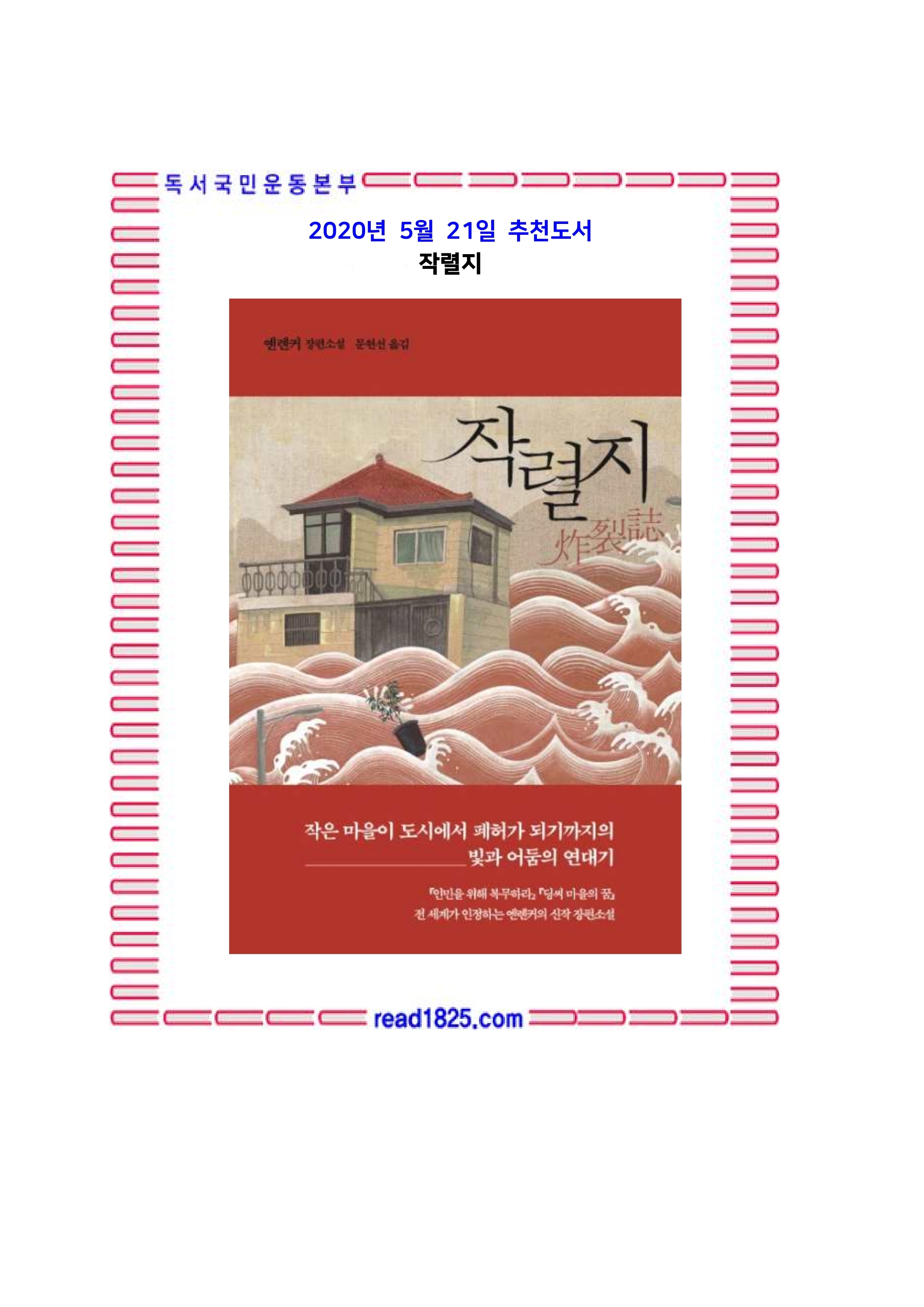 『인민을 위해 복무하라』 『딩씨 마을의 꿈』를 쓴 전 세계가 인정하는 옌롄커의 신작 장편소설! 제1회, 2회 루쉰문학상과 제3회 라오서문학상을 수상하고, 해마다 가장 유력한 노벨문학상 후보로 호명되는 옌롄커 작가의 신작 장편소설 『작렬지』가 자음과모음에서 출간되었다. 『인민을 위해 복무하라(爲人民服務)』 『딩씨 마을의 꿈(丁莊夢)』 『사서(四書)』와 마찬가지로 이 작품 역시 중국 현실을 정면으로 다뤘다는 이유 때문에 금서로 지정될 위기에 놓이기도 했다. 하지만 출간 즉시 15만 부 이상 팔리면서 다시 한번 작가의 저력을 확인시켜주었다.