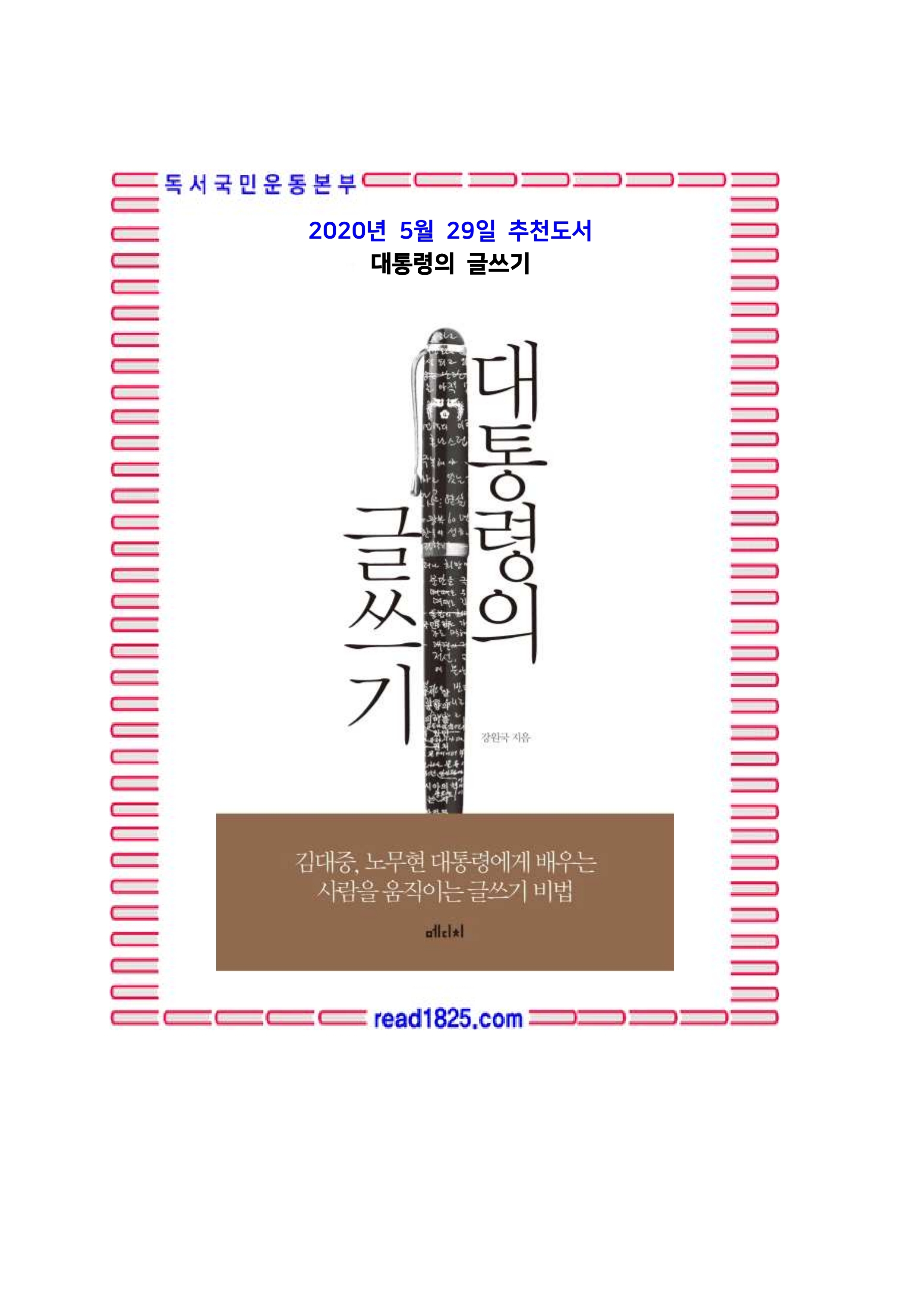 김대중, 노무현 전 대통령에게 배우는 사람을 움직이는 글쓰기 비법 『대통령의 글쓰기』. 현대인은 기획안부터 SNS 글쓰기까지, 수많은 글쓰기 상황에 노출되고 스트레스를 받는다. 서류작성을 위해 문서작성 프로그램의 하얀 창을 켜놓고 쓰고 지우기를 수십 번 반복했던 경험은 누구나 한번쯤 있을 것이다.