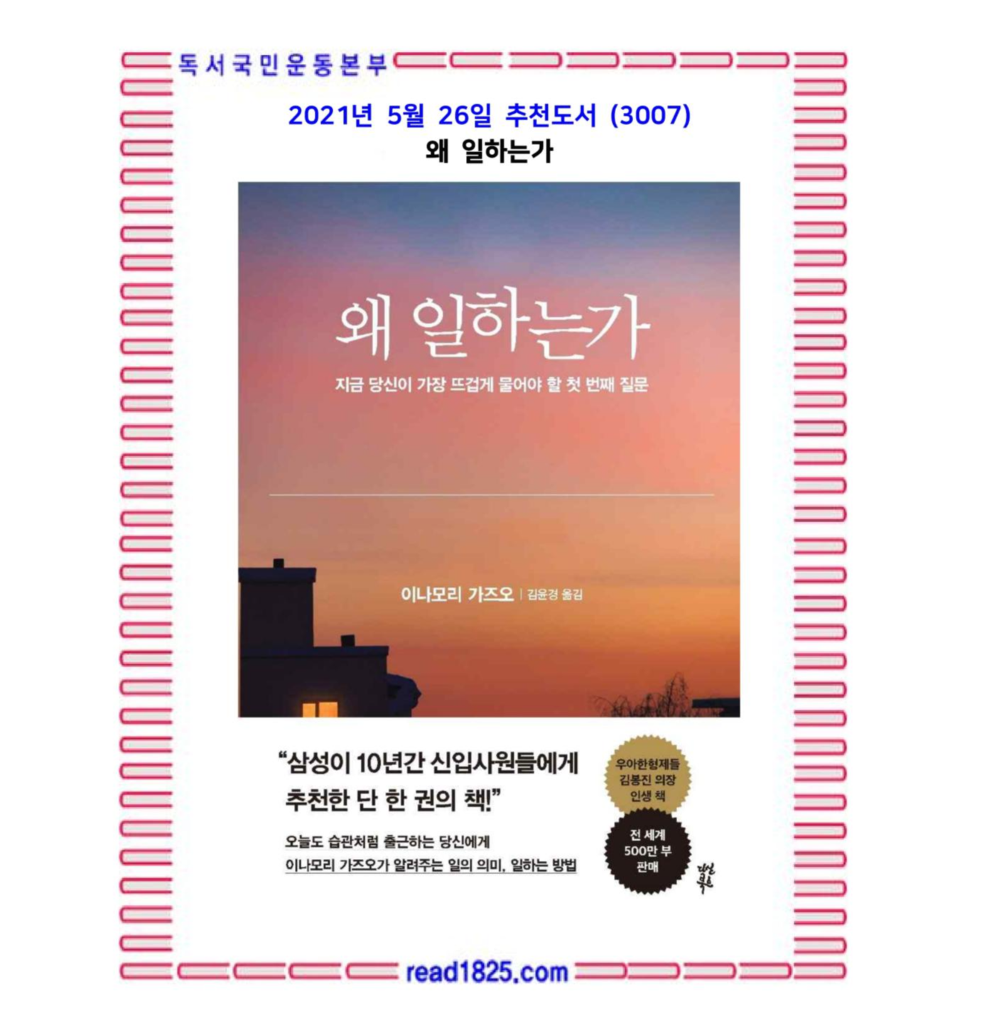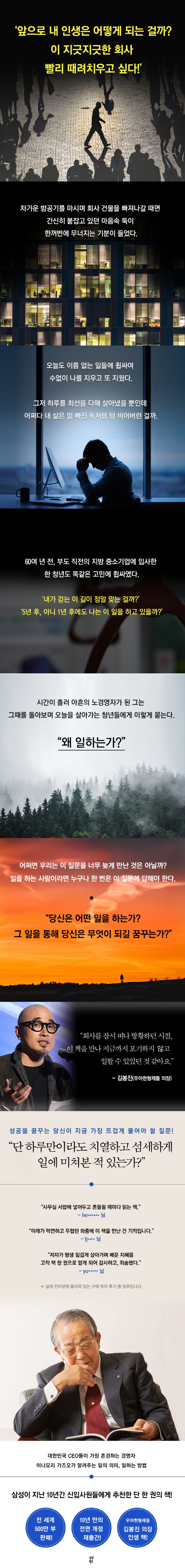 2014년 삼성그룹 임직원 도서 바자회에서 계열사 임원들 사이에 뜨거운 화제를 모은 책이 있다. 바로 ?왜 일하는가?다. 나온 지 수년이 지난 책이었지만 ‘성공을 꿈꾸는 직장인이라면 반드시 읽어야 할 책’이라는 수식어가 붙으며 입소문이 퍼졌고, 그날 삼성물산 김신 전 대표가 소장 중인 ?왜 일하는가?가 경제경영서 중 최고가로 낙찰되기도 했다. 갈수록 일의 가치가 폄하되고 있는 시대에, 구태여 ‘일’의 의미를 묻는 이 책에 산전수전 다 겪은 직장인들이 이토록 열렬히 반응한 이유는 우리가 잠시 잊고 있었던 일의 가능성과 의미를 이 책이 다시 소환해주었기 때문이 아닐까?