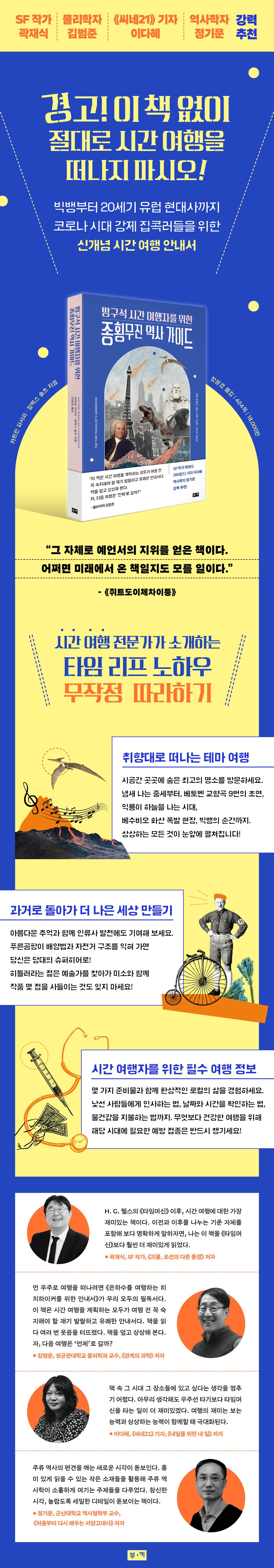 과거로 떠나는 시간 여행의 묘미는 아직 알려지지 않은 과거의 사실을 직접 가서 눈으로 보고 경험하는 데에 있다. 바야흐로 시간 여행의 황금기를 맞이한 지금, 누구든 시간 제약과 비용 걱정 없이 여행을 떠날 수 있다. 다만 역사학자와 고고학자보다는 먼저 타임머신에 오를 수 있도록 조금 서두를 필요는 있다. 그들이 미해결 상태인 과거를 모두 구명해 버려 시간 여행의 재미를 반감시키기 전에 말이다. 간혹 과거를 흘러간 것으로 단정해 버리는 사람들이 있다. 그들은 역사란 어딘가 지루하고 정적이며 죽어 있다고 생각할 것이다. 하지만 이 신개념 여행 안내서는 이러한 편견을 모두 깨부순다. 이 책을 통해 우리가 경험할 과거는 영국의 역사학자 이언 모티머의 말처럼 ‘무언가가 일어나는 과정이라 상상하는 즉시, 완전히 새롭게 인식’될 것이다.(22쪽)