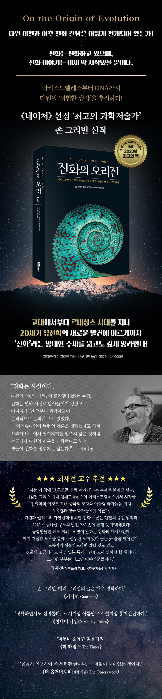 “나는 이 책에 ‘조곤조곤 진화 이야기’라는 부제를 붙이고 싶다. 기원전 그리스 시대 엠페도클레스와 아리스토텔레스에서 시작한 진화학의 여정은 고대 중국의 장자와 이슬람 학자들을 거쳐 서유럽과 영국 학자들에게 이른다. 다윈과 월리스의 자연선택에 의한 진화 이론은 멘델의 유전 법칙과 DNA 이중나선 구조의 발견으로 손에 잡힐 듯 명백해졌다. 등장인물만 해도 거의 150명에 달하는 진화의 대서사인데 마치 겨울밤 모닥불 곁에 두런두런 모여 앉아 듣는 듯 술술 넘어간다. 모름지기 생물학도라면 말할 것도 없고 진화에 조금이라도 관심 있는 독자라면 반드시 읽어야 할 책이다. 그리빈 부부는 타고난 이야기꾼들이다.”