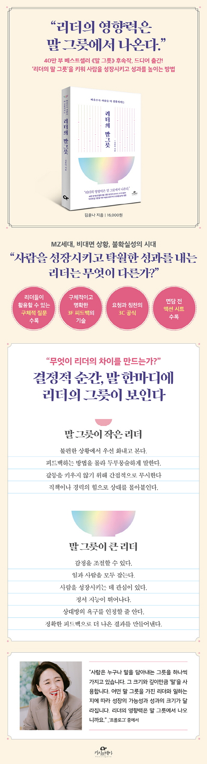 사람은 누구나 말을 담아내는 그릇을 하나씩 가지고 살아간다. 그 크기와 깊이만큼 ‘말’을 사용한다. 《말 그릇》의 김윤나 작가가 3년 만에 《리더의 말 그릇》으로 돌아왔다. 그 사이 한 주도 강의를 거르지 않았을 만큼 많은 리더들을 만나고 3~6개월에 걸친 1:1 코칭을 진행했다. 이 책은 그동안 수많은 교육과 코칭을 통해 얻은 말에 대한 근본적인 성찰을 바탕으로 사람을 성장시키고 성과를 만드는 리더의 말 그릇에 대해 알려준다. 구체적이고 다양한 사례를 통해 현장에서 바로 써먹을 수 있도록 리더의 질문기술, 3F 피드백의 기술, 요청과 칭찬의 3C 공식, 면담 전 액션 시트까지 수록해 실용성을 높였다. 이 책에서 부르는 리더는 특정 직업, 연차와 직책을 의미하지 않는다. 당신에게 한 명이라도 파트너와 팔로워가 있다면 ‘리더’이고, 사람 사이에서 ‘관계’와 ‘성과’를 고민하는 사람이라면 그가 바로 ‘리더’이다. 어떤 말 그릇을 가진 리더와 일하는지에 따라 성장의 가능성과 성과의 크기가 달라진다. 리더의 말 그릇을 키워 사람을 성장시키고 성과를 높이는 방법을 담았다.