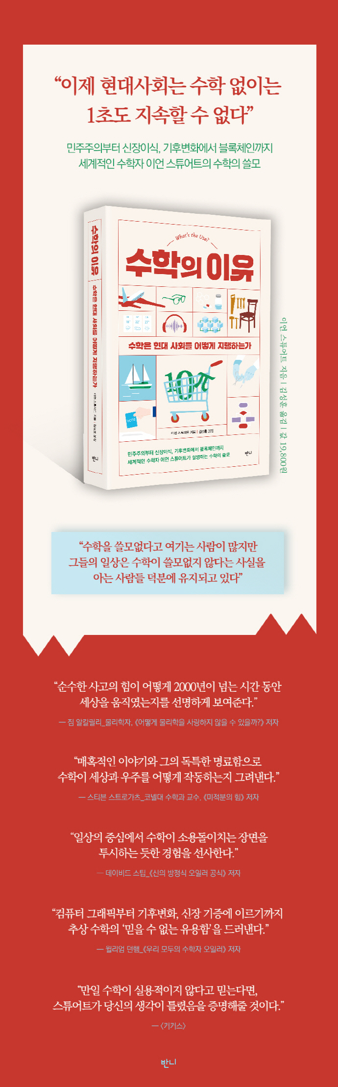수학은 단순히 지루한 계산이 아니다. 우리 세계에 대한 심오한 통찰력을 제공하여 현대 사회를 작동시키는 거대한 결과물을 만들어내는 도구다. 세계적 수학자 이언 스튜어트는 민주주의부터 신장이식, 기후변화와 블록체인까지 흥미로운 이야기를 잔뜩 들고 와서 우리에게 ‘수학의 이유’를 선명하게 전한다.