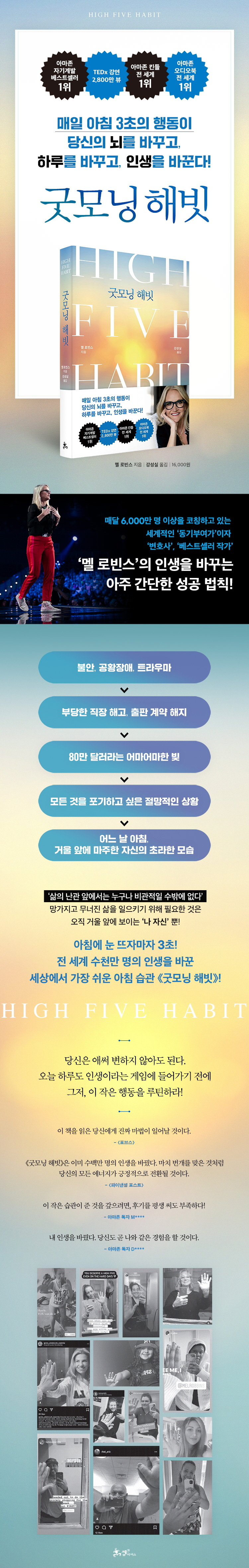 ‘전 세계에서 강연 신청이 가장 빨리 마감되는 강사’, ‘매달 6,000만 명을 코칭하는 세계적인 라이프코치’ 멜 로빈스 신작 《굿모닝 해빗》은, 매일 아침 단 3초 만에 뇌를 바꾸고, 하루를 바꾸는 강력한 리추얼을 소개한다. 바로 눈 뜨자마자 화장실로 달려가 ‘거울 속 자신과 하이파이브’ 하기다. 이 쉽고도 독특한 행동이 어떻게 뇌를 바꿀까? 신경가소성의 원리와 뇌 속 배터리를 깨우는 뉴로빅스에 비밀이 숨어 있다.