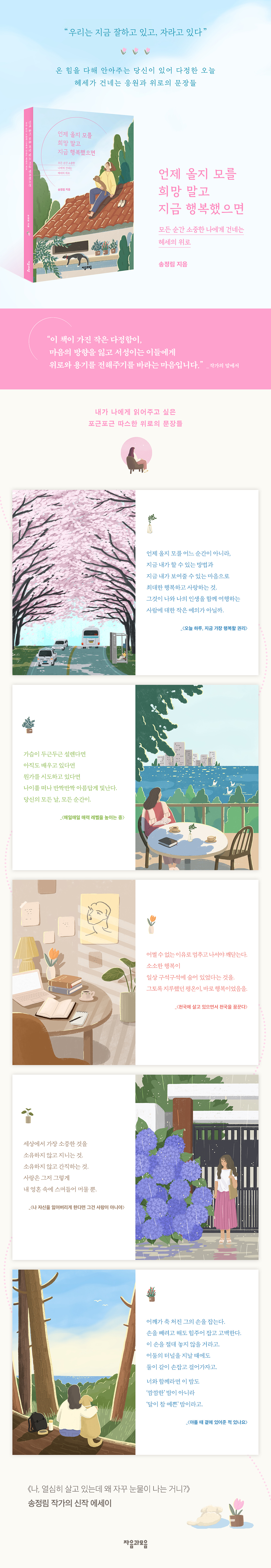 이 문장들은 유리멘털의 소유자였던 작가가 삶의 문턱에 부딪힐 때마다 방향을 결정하고 마음을 위로하고 질문에 답을 찾아갈 수 있도록 이끌어주었다. 각각의 문장과 이어지는 글에서는 드라마, 에세이 작가로 매일 쓰는 삶을 살아온 작가의 삶에 한 겹 두 겹 감싸고 있던 슬프고 애틋했던 순간이 따뜻한 시선을 만나 아름답게 펼쳐진다.