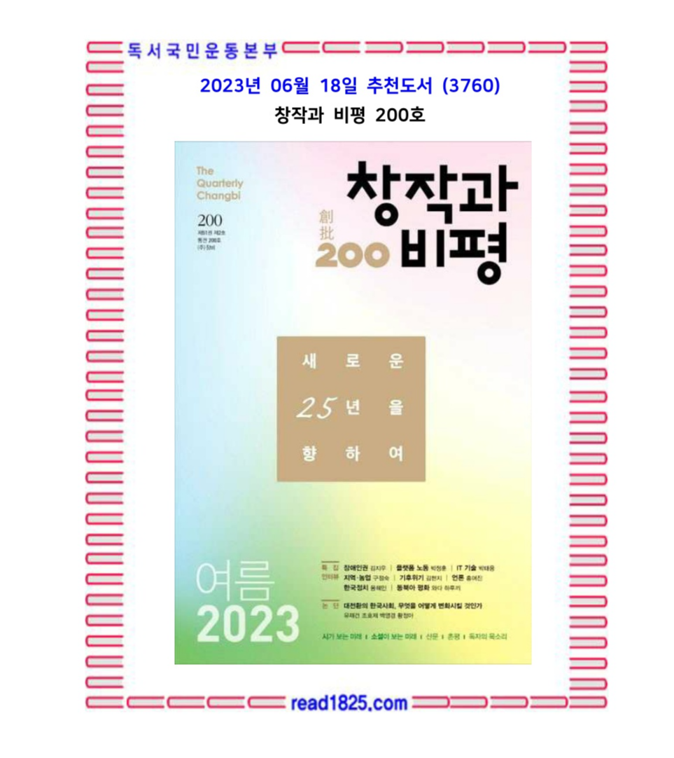 이 계절 주목할 만한 도서를 선정해 소개해오던 촌평은, 200호를 맞아 특별히 지난 25년간 출간된 도서를 다룬다. 영화감독 임선애, 영화배우 박정민, 시인 김해자, 문학평론가 정홍수 등 10명의 평자들이 문학과 인문서, 만화까지 다양한 분야의 책들 가운데 ‘다시 읽고 싶은 책’을 선정하여 현재적인 시선으로 재조명한다. 도서 내용에 대한 소개는 물론 평자의 깊이있는 감상과 사유가 담긴 이번호의 촌평 글이 흥미롭게 가닿기를 바란다.