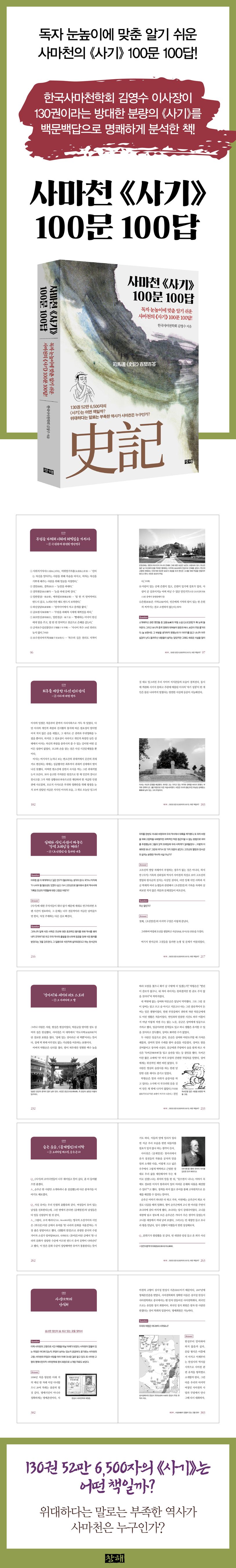 이번에 펴낸 《사마천 사기 100문 100답》은 사마천과 《사기(史記)》 관련 최고의 전문가가인 한국사마천학회 김영수 이사장이 중학생 이상이면 누구나 읽을 수 있게 쉽게 편집했다.