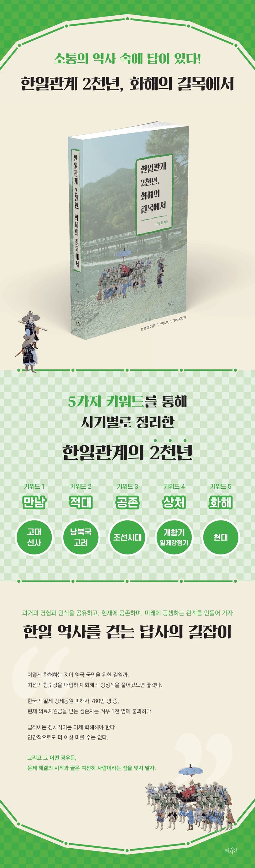 이제 코로나에서 벗어나 점차 일상으로 돌아가고 있다. 이 시점에서 역사의 시계를 거꾸로 돌리는 어리석음을 반복할 수 없다. 그동안 쌓아온 한일관계의 역사적 경험을 무의미하게 만들 수는 없다. 이제라도 ‘한일관계 2천년, 역사의 길’을 걸으며, 과거의 경험과 인식을 공유(共有)하고, 현재에 공존(共存)하며, 미래에 공생(共生)하는 관계를 만들어 가자. 그런 관점에서 이 책이 한일관계를 이해하고, 한일 역사를 걷는 답사의 길잡이가 되었으면 좋겠다.