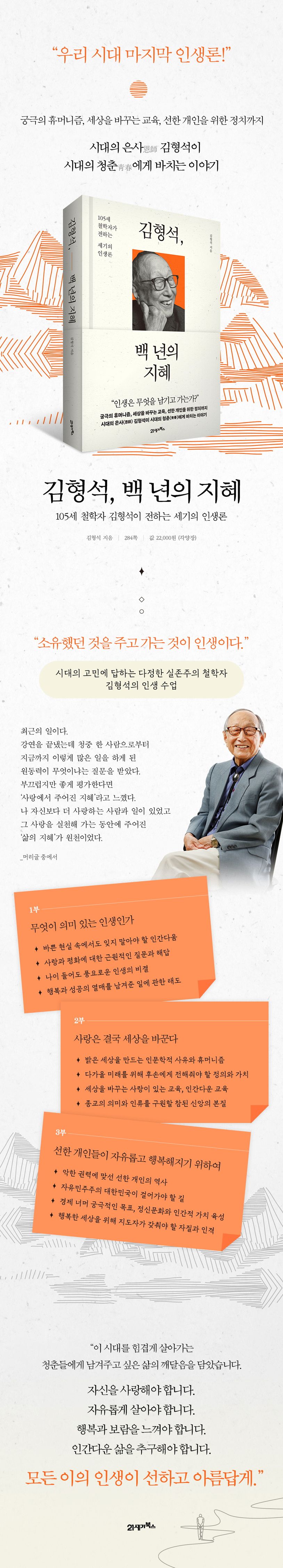 『김형석, 백 년의 지혜』는 저자의 경험을 토대로 세 가지 관점으로 삶에 대한 통찰을 웅장하고 대담하게 제시한다. 첫째로 철학계 거목으로서 빠르게 변화하는 세상에 바쁜 일상을 살아가는 대중이 잊어버린 사랑과 자유, 평화에 대한 근원적인 질문과 해답을 던져준다. 둘째로 교육자로서 다가올 미래를 위해 후손에게 전해줘야 할 정의는 무엇인지 다룬다. 마지막으로 일제강점기와 한국전쟁, 산업화와 민주화 시대의 산증인으로서 이념적 갈등으로 위태로운 한국인에게 다정하지만 예리한 일침을 전해준다. 이 책은 세상의 파도에 흔들리지 않는 인간을 만드는 최후의 가치를 사유토록 하여 인생의 스승이 필요한 남녀노소에게 꼭 필요한 삶의 지침서가 되어줄 것이다.