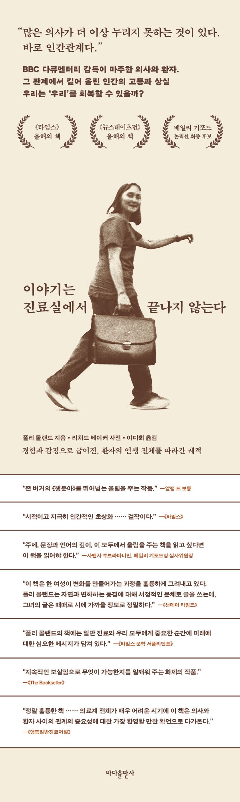 폴리 몰랜드는 자신이 마주한 장면에서 인간의 고통과 외로움을 길어 올린다. 그리고 예전에는 당연했지만 지금은 사라진 환자와 의사, 그 관계의 상실을 발견하다. 우리는 ‘우리’를 회복할 수 있을까? 어쩌면 이 책에서 그 실마리를 발견할 수 있을지도 모른다.