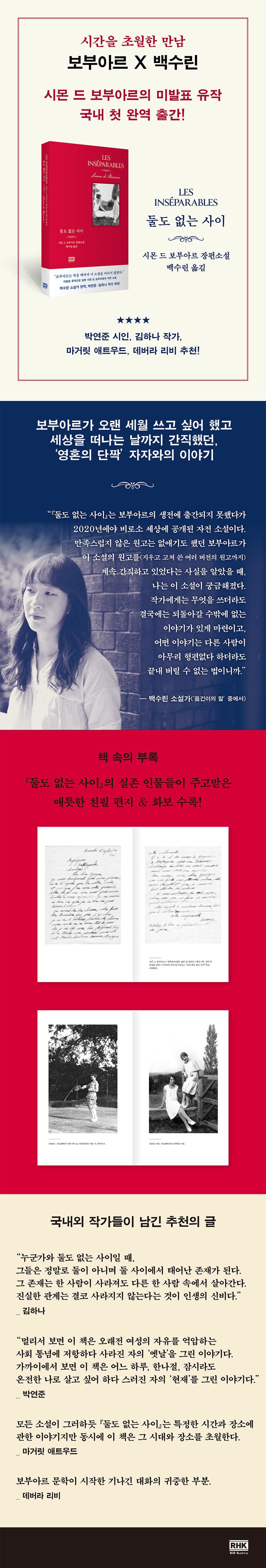 시몬 드 보부아르의 미발표 유작 『둘도 없는 사이』가 백수린 소설가의 번역으로 출간되었다. “여자는 태어나는 것이 아니라 만들어지는 것”이라는 페미니즘의 고전적 명제로 기억되는 작가 시몬 드 보부아르는 한국에서도 대표작 『제2의 성』, 프랑스 최고 문학상인 공쿠르상 수상작 『레 망다랭』 등으로 잘 알려져 있다. 『둘도 없는 사이』는 보부아르의 생전에 출간되지 못했다가 그녀의 입양 딸인 실비 르 봉 드 보부아르에 의해 2020년에야 비로소 세상에 공개되어 화제를 모았던 작품이다. 보부아르 사후 40년 가까이 흐른 지금, 소설가 백수린의 국내 첫 완역으로 마침내 한국 독자들을 만나게 되었다. 보부아르에게 사랑과 동경의 대상이었던 친구 ‘자자’의 이야기를 다룬 자전 소설이기에 실존 인물들의 모습을 담은 희귀 화보와 친필 편지가 부록으로 수록된 원서의 구성을 최대한 살려 편집했다.