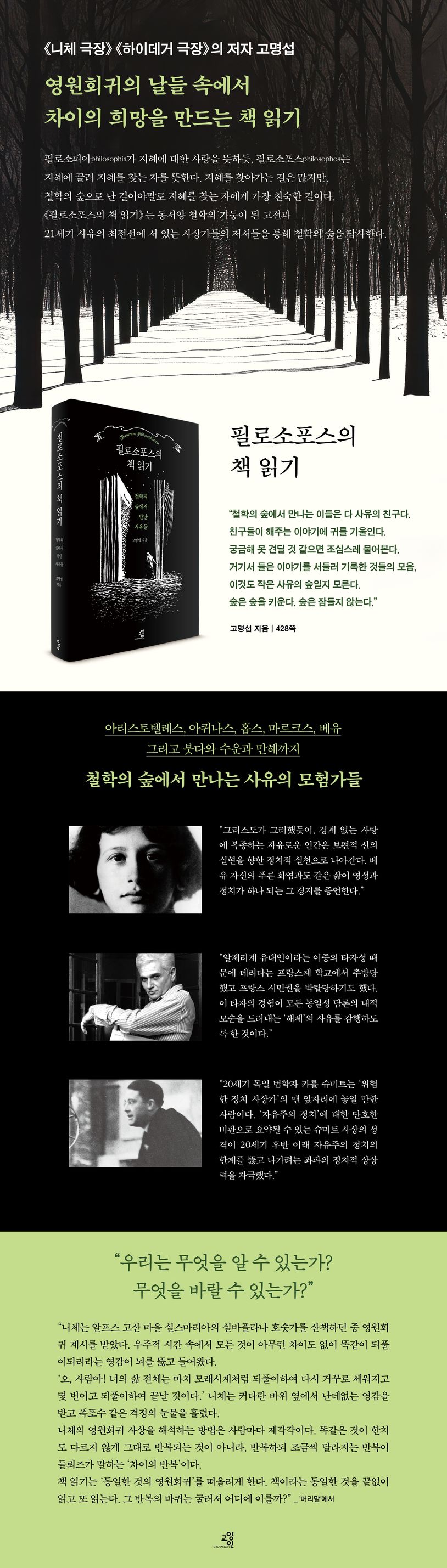저자에게 책 읽기는 “모르는 곳을 돌아다니는 오디세우스의 모험, 끝없이 되풀이되는 니체의 영원회귀”를 닮았다. 그리하여 이 책은 철학의 숲을 찾는 필로소포스들을 위한 지도이자, 정확하고 확실한 앎을 향해 끝없이 계속되는 모험을 담은 정신의 오디세이아라 할 수 있다.