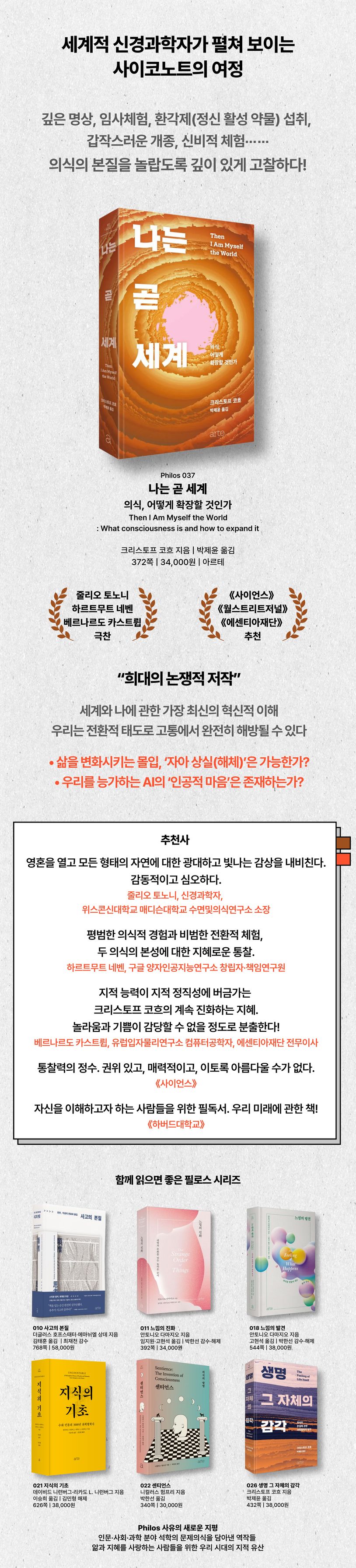 미국의 앨런뇌과학연구소의 조사관으로서 신경세포 모델링 연구를 주도하는 세계적 신경과학자 크리스토프 코흐의 신간이 『나는 곧 세계: 의식 어떻게 확장할 것인가』(필로스 시리즈 37번)로 출간되었다.