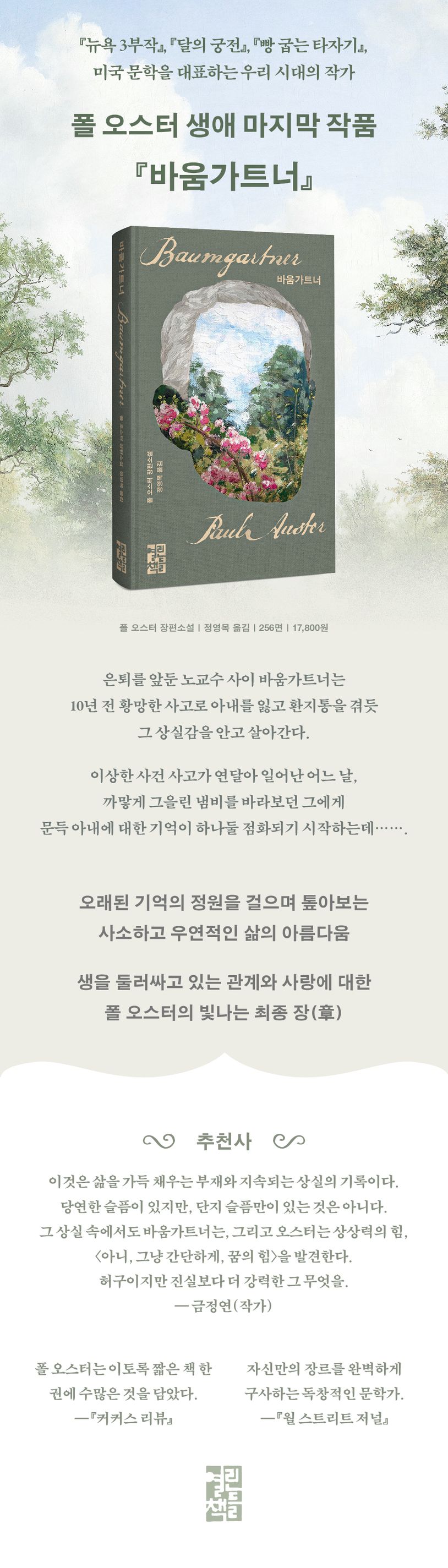 〈떠오르는 미국의 별〉이라는 찬사 속에 데뷔하여 반세기 넘도록 소설과 산문 모두에서 발군의 기량을 발휘하며 미국 문학을 대표하는 작가로 견고히 자리 잡은 작가 폴 오스터. 그가 투병 중 끝을 예감하며 집필한 생애 마지막 장편소설 「바움가트너」가 정영목 씨의 번역으로 열린책들에서 출간되었다. 폴 오스터 1주기에 맞춰 출간된 이 작품은 은퇴를 앞둔 노교수 사이 바움가트너를 통해 상실과 애도, 기억과 현재, 시간의 흐름과 삶의 의미를 내밀한 시선으로 담아냈다. 초기작들을 연상시키면서도 삶의 막바지에 이른 작가의 원숙한 사유 또한 보여 준다는 평가를 받은 이 소설은, 이상한 사건 사고가 연달아 일어난 어느 날 까맣게 그을린 냄비를 바라보던 바움가트너에게 문득 인생의 사랑이었던 아내에 대한 기억이 점화되며 시작된다.