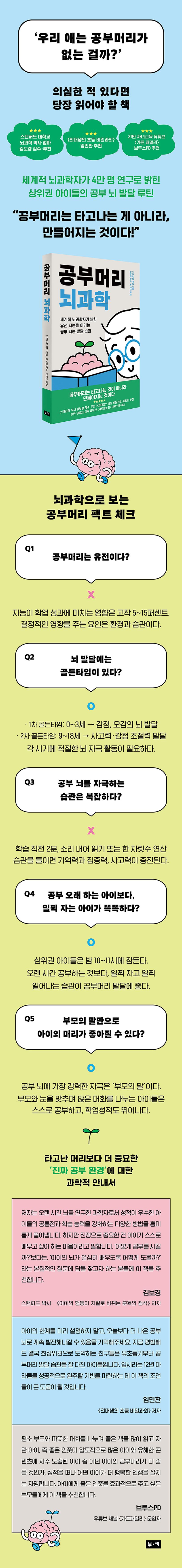 『공부머리 뇌과학』은 단순히 성적을 높이는 기술서가 아니라 아이의 두뇌와 감정, 습관을 함께 설계하는 과학 기반 부모 지침서다. “아이에게 어떻게 공부를 시킬까?” 오늘도 고민하는 부모에게, 이 책은 아이 스스로 깊고 단단한 배움의 여정을 시작하도록 이끄는 든든한 길잡이가 되어줄 것이다.