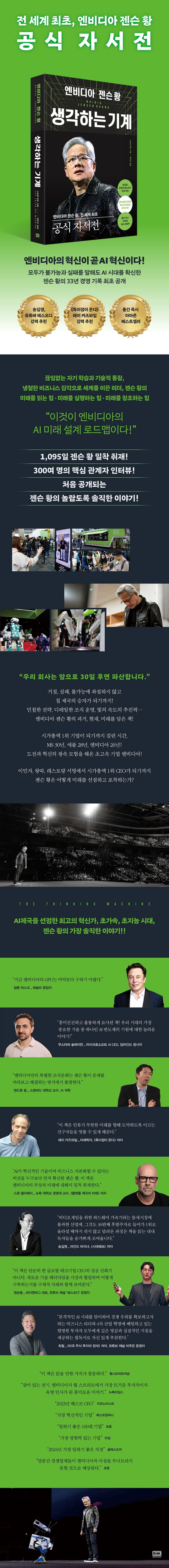엔비디아는 마이크로소프트가 개인용 컴퓨터를 보편화시키며 만들어낸 기술 혁명에 버금가는 AI 혁명을 만들어낸 장본인이다. 주지하듯 이 기업은 본래 고사양 그래픽카드를 생산 · 판매하는 틈새시장의 후발주자였다. 그들이 만들어낸 첫 제품은 심지어 실패했다. 하지만 위기 앞에서 어떻게든 기회를 찾아냈다. 포기하지 않았고, 기존의 틀을 버리고, 새로운 기회를 스스로 만들어냈다. 그들이 집중한 기술은 누구도 성공을 말하지 않던 분야였다. 테크기업은 물론, 월스트리트의 벤처투자자들조차 모두 불가능하다고 한 일이었다. 하지만 그들은 고전을 면치 못하면서도 꿋꿋하게 그리고 끈질기게 기술을 개발하며 마침내 전 세계 모든 기업이 탐내는 마이크로칩을 만들어냈다. 그리고 이 성공 신화의 한복판에는 CEO 젠슨 황의 비전, 실행력, 리더십이 자리하고 있다. 젠슨 황은 교체가 잦은 실리콘밸리 테크기업의 CEO 중 재임 기간이 가장 긴 33년에 달하고 있다. 신간 《엔비디아 젠슨 황, 생각하는 기계(원제: The Thinking Machine)》는 끊임없는 자기 학습과 기술적 통찰, 냉철한 비즈니스 감각으로 새로운 세계를 연 그가 최초로 밝히는 33년간의 분투기이다.