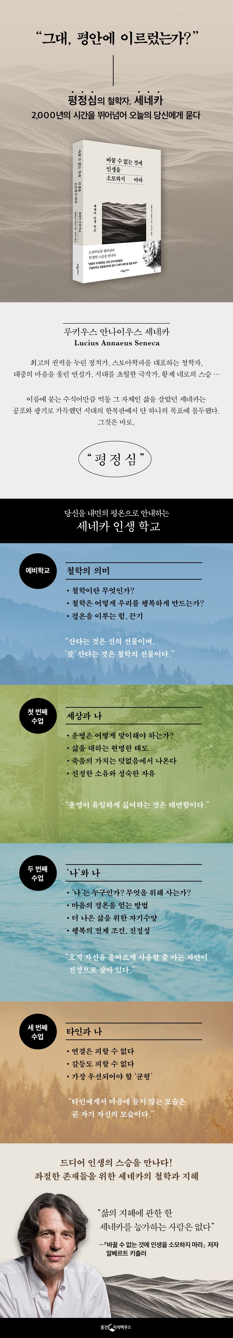 『바꿀 수 없는 것에 인생을 소모하지 마라』는 종이와 잉크로 지어진 ‘인생 학교’다. 세네카의 철학과 삶을 깊이 파고들어 그 안에 담긴 지혜를 톺아 올린 이 책은 평정심을 찾는 길로 독자를 이끈다. 요동치는 세상에 휩쓸리지 않고 오롯이 ‘나’의 삶을 살아가길 원하는 모든 이들에게 이 책이 좋은 안내서가 되어줄 것이다.