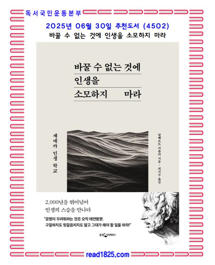 우리는 살아가면서 다양한 도전 과제들을 맞닥뜨린다. 그중에는 어찌할 수 없는 외부 환경으로 인한 것도 있고, 함께 살아가는 사람들과 관련한 것도 있고, 자기 자신과의 관계에서 비롯한 것도 있다. ‘잘 산다’라는 것은 결국 이 문제들을 얼마나 잘 다루느냐에 달려 있다. 『바꿀 수 없는 것에 인생을 소모하지 마라』는 세네카의 가르침을 총 네 개의 장을 통해 전한다.