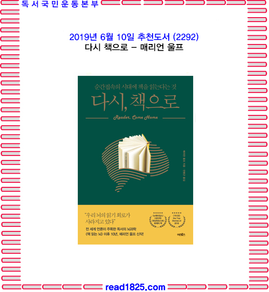 “점점 디지털화하는 이 세계에서 다른 어떤 활동보다 소셜미디어와 게임에 더 많은 시간을 보내는 많은 아이들이 깊이 읽는 독자로 성장할 거라 기대할 수 있을까? 부모와 교육자들의 생각을 완전히 바꿔놓을 이 필독서에서 매리언 울프는 우리 뇌의 복잡한 작동 방식에 관해 알려주는 한편, 우리가 기술을 언제 사용해야 할지, 그리고 언제 사용하지 말아야 할지를 보여준다.”
