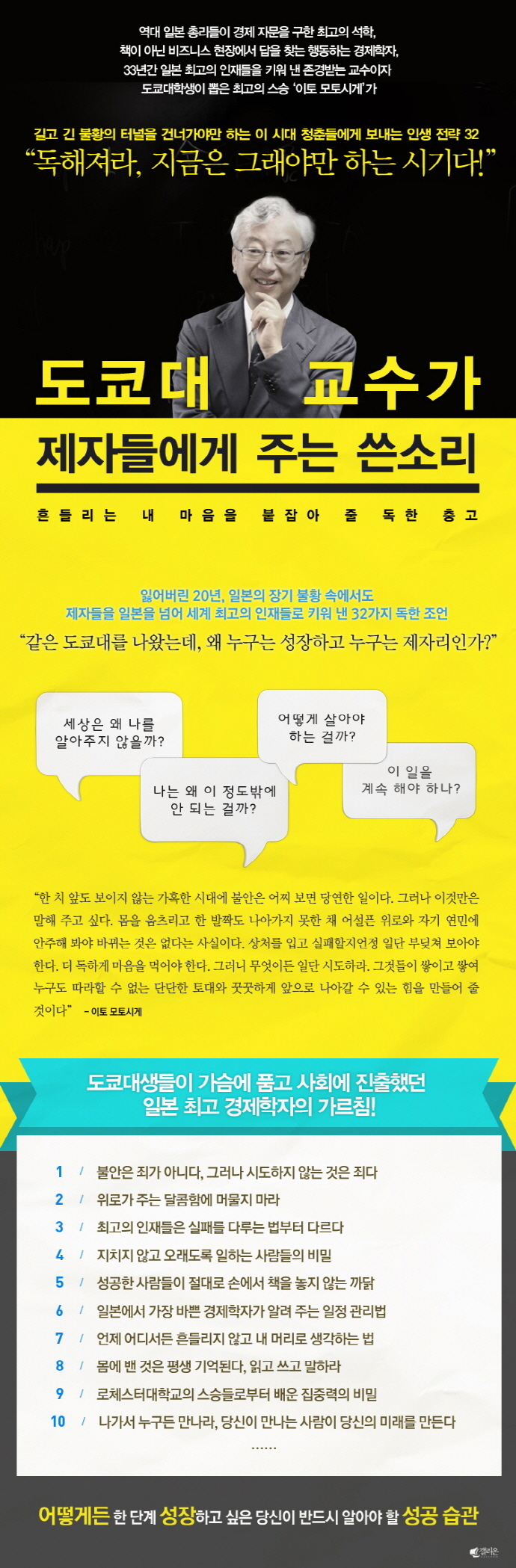 『도쿄대 교수가 제자들에게 주는 쓴소리』는 역대 일본 총리들의 경제 자문 역할을 해온 도쿄대학교 경제학부 교수 이토 모토시게가 정년을 앞두고 제자들에게 꼭 해 주고 싶은 32가지 쓴소리를 담은 책이다. 나약한 자기 연민이나 어쭙잖은 위로에 안주하기보다는 용감하게 부딪쳐 보며 길을 찾아갈 것을 권하는 저자는 흔들리는 마음을 붙잡아 줄 엄한 충고뿐만 아니라 오늘보다 내일 한 뼘 더 성장하고픈 사람들을 위한 구체적이고 실질적인 32가지 인생 전략들을 제시한다.