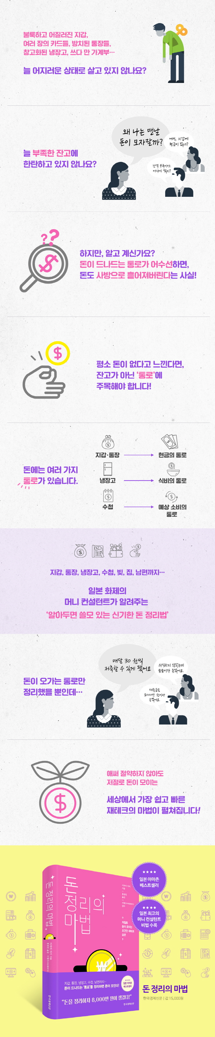 일본에서 주목받는 머니 컨설턴트 이치이 아이의 쉽고 빠른 돈 정리법『돈 정리의 마법』. 특별히 쓴 것도 없는데 늘 돈이 없고, 도대체 어디에 썼는지 몰라 한탄하는 이들에게 묻는다. 과연 진짜 돈이 없는 걸까? 저자는 돈이 얼마나 남아 있는지 잔고만을 의식할 게 아니라 돈이 오가는 '통로'를 주목해야 한다고 조언한다.