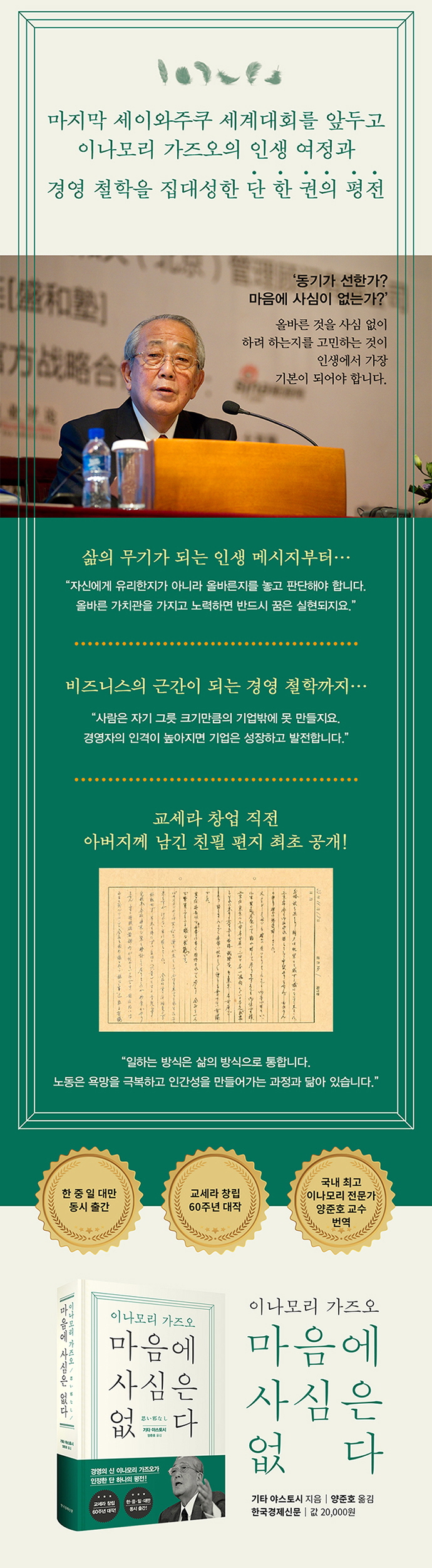 일본 교세라의 창업자이자 명예회장이며, 전 세계인들이 배우고 싶어 하는 기업가, 그리고 한국인이 가장 좋아하는 일본 기업인이기도 한 이나모리 가즈오. 2019년 교세라 창립 60주년을 맞아 ‘경영자들의 스승’, ‘살아 있는 경영의 신’으로 불리는 이나모리 가즈오의 일생과 경영철학을 총망라해 집대성한 대작《마음에 사심은 없다》가 한국, 일본, 중국, 대만에서 동시 출간되었다. 지금까지 수많은 이나모리 가즈오의 저서들이 쏟아져 나왔지만, 처음부터 전 세계 동시 출간이라는 목표로 야심차게 진행해온 대대적인 프로젝트이며, 그가 인정한 단 하나의 인생전기이라는 점에서 그 의미를 더한다.